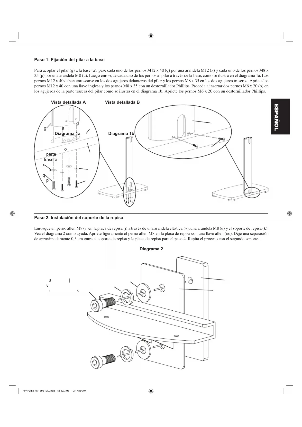 Sanus Systems 2221 Hwy 36 West, Saint Paul, MN 55113, USA Customer Service: 800.359.5520. See complementary Sanus products at www.sanus.comESPAÑOL L A U N I Ó N D E F O R M A Y F U N C I Ó N Sanus Systems 2221 Hwy 36 West, Saint Paul, MN 55113, USA Servicio de atención al cliente:(800) 359-5520. Vea los productos complementarios de Sanus en el sitio www.sanus.com Instrucciones de ensamblaje del mueble Platinum de Sanus Systems modelo: PFFP2 Gracias por elegir el mueble Platinum de Sanus Systems. El modelo PFFP2 ha sido diseñado para soportar un televisor con pantalla plana de 30 a 50 pulgadas y un peso de hasta 59 kg. Si tiene preguntas con respecto a éste u otros productos de Sanus Systems, llámenos al 800.359.5520 (en EE.UU.) o al 31 (0) 20 5708938 (en Europa). También nos puede visitar en nuestro sitio www.sanus.com. Nuestros representantes del servicio de atención al cliente le ayudarán oportunamente con cualquier duda que tenga en relación con el ensamblaje o las piezas que falten. Revise los productos cuidadosamente para asegurarse de que no falte ninguna pieza ni estén defectuosas. Nunca use piezas defectuosas. Las piezas de repuesto para los productos comprados a través de un distribuidor autorizado se enviarán directamente a usted. Llame a Sanus Systems antes de devolver los productos a la tienda donde los compró. Herramientas necesarias: Juego de llaves macho o inglesas, destornillador Phillips Piezas: Algunas piezas no se muestran a la misma escala* (1) Base - a (1) Soporte para pared - b (1) Repisa grande de vidrio - c (1) Repisa pequeña de vidrio - d (1) Soporte derecho del monitor - e (1) Soporte izquierdo del monitor - f (1) Pilar - g (1) Placa para pared - h* (2) Espaciador del soporte para pared - i* (2) Placa de repisa - j* (2) Soporte de repisa - k* (2) Arandela para repisa de vidrio - l* (2) Tapa del soporte de repisa - m* (1) Tapa superior - n*ESPAÑOL Tornillería: Toda la tornillería se muestra a tamaño real (2) Perno M6 x 20 - o (2) Perno M8 x 35 - p (2) Perno M12 x 40 - q (6) Perno allen M8 - r (4) Perno allen 1/4-20 - s (2) Perno de seguridad - t (8) Arandela M8 - u (6) Arandela elástica - v (4) Arandela de plástico - w (2) Arandela M12 - x Tornillería para instalación del TV: (4) Perno M4 x 12 - y (4) Perno M5 x 12 - z (4) Perno M6 x 12 - aa (4) Perno M8 x 16 - bb (4) Perno M4 x 30 - cc (4) Perno M5 x 30 - dd (4) Perno M6 x 35 - ee (4) Perno M8 x 40 - ff (4) Arandela de seguridad M4 - gg (4) Arandela de seguridad M5 - hh (4) Arandela de seguridad M6 - ii (4) Arandela de seguridad M8 - jj (8) Arandela M4/M5 - kk (4) Arandela M6/M8 - ll (4) Espaciador M4/M5 - mm (4) Espaciador M6/M8 - nn (3) Llave allen - ooESPAÑOL Paso 1: Fijación del pilar a la base Para acoplar el pilar (g) a la base (a), pase cada uno de los pernos M12 x 40 (q) por una arandela M12 (x) y cada uno de los pernos M8 x 35 (p) por una arandela M8 (u). Luego enrosque cada uno de los pernos al pilar a través de la base, como se ilustra en el diagrama 1a. Los pernos M12 x 40 deben enroscarse en los dos agujeros delanteros del pilar y los pernos M8 x 35 en los dos agujeros traseros. Apriete los pernos M12 x 40 con una llave inglesa y los pernos M8 x 35 con un destornillador Phillips. Proceda a insertar dos pernos M6 x 20 (o) en los agujeros de la parte trasera del pilar como se ilustra en el diagrama 1b. Apriete los pernos M6 x 20 con un destornillador Phillips. Vista detallada A Vista detallada B