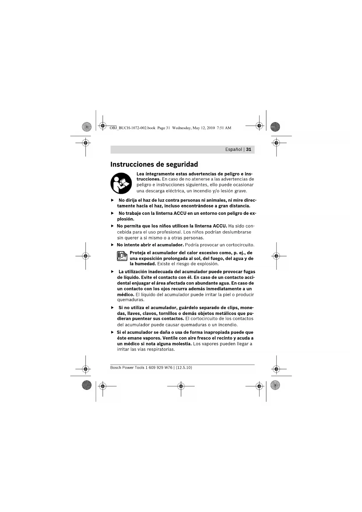 Instrucciones de seguridad Lea íntegramente estas advertencias de peligro e ins- trucciones. En caso de no atenerse a las advertencias de peligro e instrucciones siguientes, ello puede ocasionar una descarga eléctrica, un incendio y/o lesión grave. f No dirija el haz de luz contra personas ni animales, ni mire direc- tamente hacia el haz, incluso encontrándose a gran distancia. f No trabaje con la linterna ACCU en un entorno con peligro de ex- plosión. f No permita que los niños utilicen la linterna ACCU. Ha sido con- cebida para el uso profesional. Los niños podrían deslumbrarse sin querer a si mismo o a otras personas. f No intente abrir el acumulador. Podría provocar un cortocircuito. Proteja el acumulador del calor excesivo como, p. ej., de una exposición prolongada al sol, del fuego, del agua y de la humedad. Existe el riesgo de explosión. f La utilización inadecuada del acumulador puede provocar fugas de líquido. Evite el contacto con él. En caso de un contacto acci- dental enjuagar el área afectada con abundante agua. En caso de un contacto con los ojos recurra además inmediatamente a un médico. El líquido del acumulador puede irritar la piel o producir quemaduras. f Si no utiliza el acumulador, guárdelo separado de clips, mone- das, llaves, clavos, tornillos o demás objetos metálicos que pu- dieran puentear sus contactos. El cortocircuito de los contactos del acumulador puede causar quemaduras o un incendio. f Si el acumulador se daña o usa de forma inapropiada puede que éste emane vapores. Ventile con aire fresco el recinto y acuda a un médico si nota alguna molestia. Los vapores pueden llegar a irritar las vías respiratorias. OBJ_BUCH-1072-002.book Page 31 Wednesday, May 12, 2010 7:51 AM1 609 929 W76 | (12.5.10) Bosch Power Tools 32 | Español f Solamente cargar los acumuladores con los cargadores reco- mendados por el fabricante. Existe riesgo de incendio al intentar cargar acumuladores de un tipo diferente al previsto para el car- gador. f Únicamente utilice el acumulador en combinación con su herra- mienta eléctrica Bosch. Solamente así queda protegido el acumu- lador contra una sobrecarga peligrosa. f Solamente utilice acumuladores originales Bosch de la tensión indicada en la placa de características de su herramienta eléctri- ca. Si se utilizan acumuladores diferentes, como, p. ej., imitacio- nes, acumuladores recuperados, o de otra marca, existe el riesgo de que éstos exploten y causen daños personales o materiales. Descripción del funcionamiento Utilización reglamentaria La linterna ACCU ha sido diseñada para ser guiada con la mano y alumbrar en recintos secos. Componentes principales La numeración de los componentes está referida a la imagen de la lin- terna ACCU en la página ilustrada. 1 Foco 2 Interruptor de conexión/desconexión 3 Acumulador* 4 Botón de extracción del acumulador 5 Clip de sujeción al cinturón *Los accesorios descritos e ilustrados no corresponden al material que se ad- junta de serie. La gama completa de accesorios opcionales se detalla en nues- tro programa de accesorios. OBJ_BUCH-1072-002.book Page 32 Wednesday, May 12, 2010 7:51 AMEspañol | 33 Bosch Power Tools 1 609 929 W76 | (12.5.10) Datos técnicos Montaje Carga del acumulador (accesorio especial) (ver figura A) f Únicamente use los cargadores que se detallan en la página con los accesorios. Solamente estos cargadores han sido especial- mente adaptados a los acumuladores de iones de litio empleados en su linterna ACCU. Observación: El acumulador se suministra parcialmente cargado. Con el fin de obtener la plena potencia del acumulador, antes de su primer uso, cárguelo completamente en el cargador. El acumulador de iones de litio puede recargarse siempre que se quiera, sin que ello merme su vida útil. Una interrupción del proceso de carga no afecta al acumulador. El acumulador de iones de litio va protegido contra altas descargas por “Electronic Cell Protection (ECP) (Protección Electrónica de Cel- das)”. Si el acumulador está descargado, un circuito de protección se encarga de desconectar la linterna ACCU. Linterna ACCU GLI 10,8 V-LI Professional Nº de artículo 3 601 D37 U.. Tensión nominal V= 10,8 Autonomía, aprox. min 450 Temperatura de operación °C – 10 ... +40 Temperatura de almacenamiento °C – 15 ... +50 Peso según EPTA-Procedure 01/2003 kg 0,3 Preste atención al nº de artículo en la placa de características de su linterna AC- CU. Las denominaciones comerciales de algunas linternas ACCU pueden variar. OBJ_BUCH-1072-002.book Page 33 Wednesday, May 12, 2010 7:51 AM1 609 929 W76 | (12.5.10) Bosch Power Tools 34 | Español No mantenga accionado el interruptor de co- nexión/desconexión si la linterna ACCU se hubiese desconectado automáticamente. Ello podría perjudicar al acumula- dor. Para desmontar el acumulador 3 presione los botones de extracción 4 y sáquelo hacia atrás de la linterna ACCU. No proceda con brusque- dad. El acumulador viene equipado con un sensor de temperatura NTC que solamente admite su recarga dentro del margen de temperatura entre 0 °C y 45 °C. De esta manera se alcanza un larga vida útil del acumulador. Observe las indicaciones referentes a la eliminación. Operación Puesta en marcha Montaje del acumulador f Solamente utilice acumuladores de iones de litio originales Bos- ch, de la tensión indicada en la placa de características de su lin- terna ACCU. El uso de otro tipo de acumuladores puede acarrear lesiones e incluso un incendio. Monte el acumulador cargado 3 asentándolo hasta el tope en la em- puñadura, cuidando que quede enclavado de forma perceptible. Conexión/desconexión f La linterna ACCU genera un haz de luz proyectado por el foco 1. Para la puesta en marcha de la linterna ACCU accione el interruptor de conexión/desconexión 2. Para la desconexión de la linterna ACCU vuelva a accionar el interrup- tor de conexión/desconexión 2. ATENCIÓN OBJ_BUCH-1072-002.book Page 