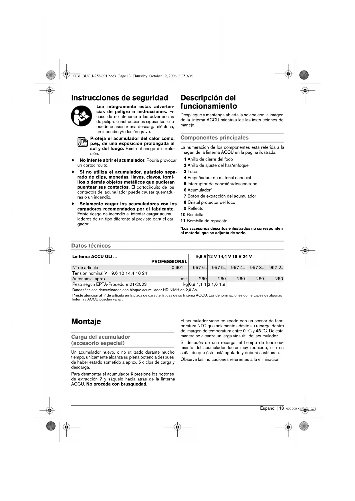 - Coloque el cristal protector 8 dentro del anillo de cierre 1 y enrosque éste en el foco 3. Preste aten- ción a que quede correctamente posicionado. Operación Puesta en marcha Montaje del acumulador f Solamente utilice bloques de acumuladores O, originales Bosch, de la tensión indicada en la placa de características de su linterna ACCU. El uso de otro tipo de acumuladores puede provocar daños e incluso un incendio. Monte el acumulador cargado 6 asentándolo hasta el tope en la empuñadura, cuidando que quede encla- vado de forma perceptible. Conexión/desconexión Para la puesta en marcha de la linterna ACCU empuje hacia arriba el interruptor de conexión/desco- nexión 5. Para la desconexión de la linterna ACCU empuje hacia la abajo el interruptor de conexión/desconexión