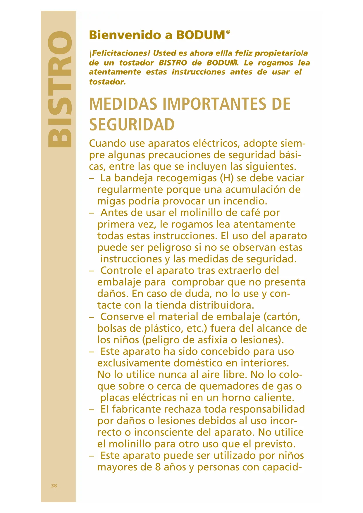 ades mentales, sensoriales o físicas reduci- das o sin experiencia y conocimiento bajo supervisión o tras haber recibido instruc- ciones sobre el uso del aparato de forma segura y entender los posibles riesgos. Este aparato no deberá ser utilizado para jugar. La limpieza y el mantenimiento no deberán ser realizados por niños, salvo que tengan más de 8 años y bajo supervisión. Mantenga el aparato y su cable fuera del alcance de los niños menores de 8 años. – No toque nunca el aparato con las manos húmedas o mojadas. No toque el cable de alimentación ni el enchufe con las manos mojadas. Desenchufe siempre el aparato retirando el enchufe de la toma de corrien- te y no tirando del cable. No deje el cable de alimentación colgando del borde de la mesa o encimera, y asegúrese de que el cable no entre en contacto con superficies calientes. No utilice el aparato si el cable o el enchufe están dañados, si no funciona bien o si presenta cualquier otra avería. – Para evitar el riesgo, regrese el electro- doméstico al próximo centro de servicios autorizado para su examinación, reparación o ajustes. – No use accesorios no recomendados por el fabricante. Esto puede causar incendios, electrocuciones o lesiones personales. – Si el aparato está dañado o no funciona bien, desconéctelo y no intente repararlo usted mismo. Todas las reparaciones deben ser realizadas exclusivamente por un centro de servicio de postventa autorizado por el fabricante. La inobservancia de estas medi- das de seguridad puede comprometer la seguridad del aparato. – Nunca intente cambiar usted mismo el40 BISTRO cable de alimentación del aparato, porque para ello se necesitan herramientas especia- les. Para garantizar la seguridad del apara- to, todo cambio o reparación del cable deben ser realizados exclusiv-amente por un centro de servicio de postventa autor- izado por el fabricante. – Desenchufe siempre el aparato de la toma cuando no lo usa y antes de proceder a la limpieza. Para la limpieza, utilice un cepillo o un paño húmedo. Desenchufe siempre el aparato de la toma cuando no lo usa y antes de proceder a la limpieza: recuerde que es un aparato eléctrico. – Para desconectarlo, póngalo en “off” y saque el enchufe de la toma de corriente. – Para evitar el riesgo de incendio, electro- cución o lesiones personales, no sumerja el cable ni el enchufe en agua u otros líqui- dos. – No introduzca en el tostador utensilios o alimentos envueltos en película protectora o demasiado grandes, porque esto puede causar incendio o electrocución. – No introduzca en la tostadora utensilios ni alimentos demasiado grandes o dentro de envases, ya que existe el riesgo de que se produzca un incendio o una descarga eléc- trica. – No introduzca objetos afilados o abrasivos en las ranuras para el pan, ya que esto puede dañar el aparato. – Las caras exteriores del tostador y las zonas alrededor de las ranuras para el pan se calientan mucho durante el uso: opere y manipule el aparato sólo con los botones y asas de plástico. – No cubra nunca el aparato durante el uso. – No enrolle el cable alrededor del tostador41