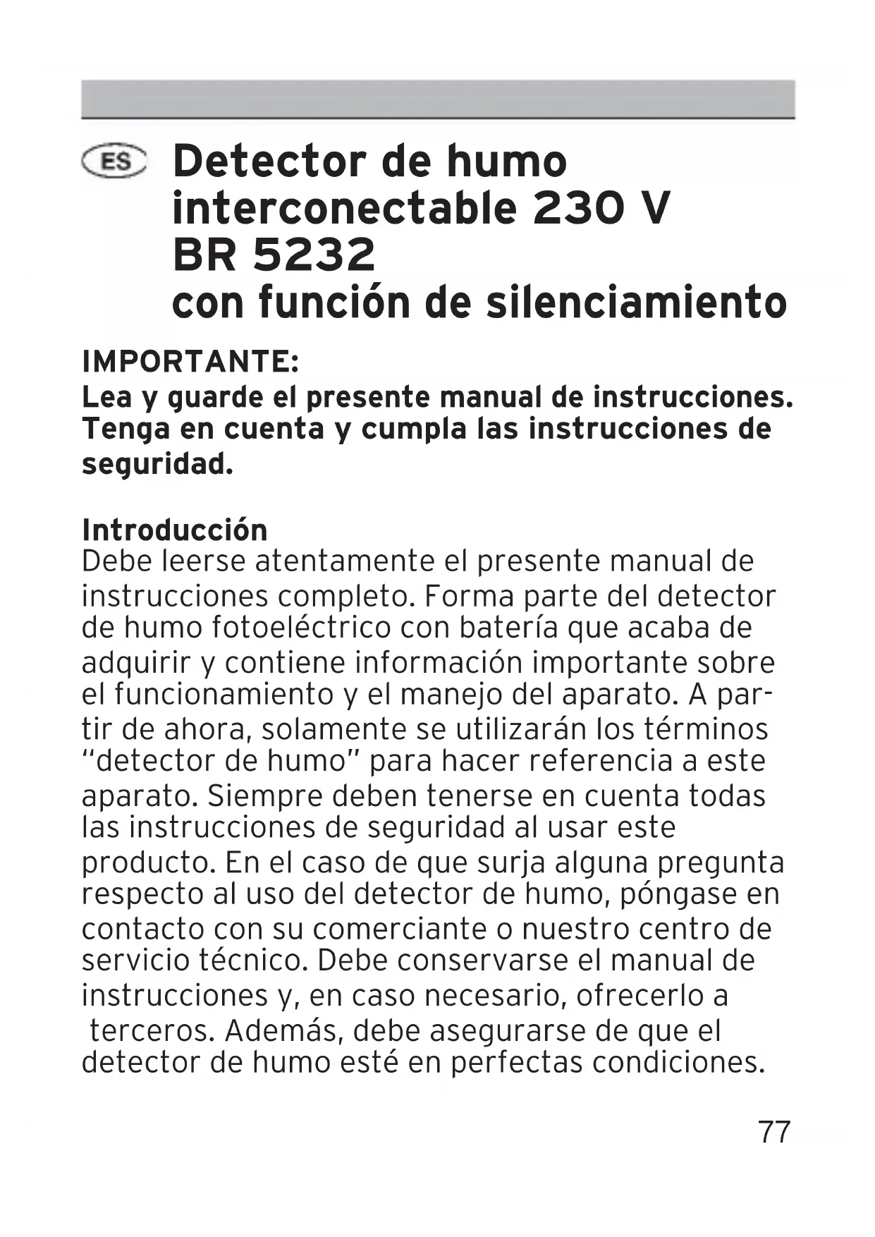 Bruksanvisning BR 5232 052109 Rauchmelder BR 5232 02.06.2009 19:19 Uhr77 Detector de humo interconectable 230 V BR 5232 con función de silenciamiento IMPORTANTE: Lea y guarde el presente manual de instrucciones. Tenga en cuenta y cumpla las instrucciones de seguridad. Introducción Debe leerse atentamente el presente manual de instrucciones completo. Forma parte del detector de humo fotoeléctrico con batería que acaba de adquirir y contiene información importante sobre el funcionamiento y el manejo del aparato. A par- tir de ahora, solamente se utilizarán los términos “detector de humo” para hacer referencia a este aparato. Siempre deben tenerse en cuenta todas las instrucciones de seguridad al usar este producto. En el caso de que surja alguna pregunta respecto al uso del detector de humo, póngase en contacto con su comerciante o nuestro centro de servicio técnico. Debe conservarse el manual de instrucciones y, en caso necesario, ofrecerlo a terceros. Además, debe asegurarse de que el detector de humo esté en perfectas condiciones. 052109 Rauchmelder BR 5232 02.06.2009 19:19 UhrDatos técnicos Aparato: BR 5232 Marca de verificación: EN 14604 Clase de protección: IP 20 Batería de reserva: batería de 9 V DC carbón-zinc (IEC 6F22)/ alcalina (IEC 6LR61) o MN1604 En el caso de fallo de la red, la batería se encarga del funciona- miento durante 1 año mínimo Corriente máx.: < 20 mA (alarma) Temperatura ambiente: 0°C – 40°C Humedad relativa del aire: 10 %- 90 % Volumen del emisor de señales: 85 dB (3 m de distancia) Duración de la batería: 1 año mín. Interconexiones: 12 detectores de humo máx. con una longitud de cable de 40 m máx. entre los respectivos aparatos Selección del lugar de montaje NOTA: Se recomienda instalar varios detectores de humo en la vivienda o en el edificio. Para