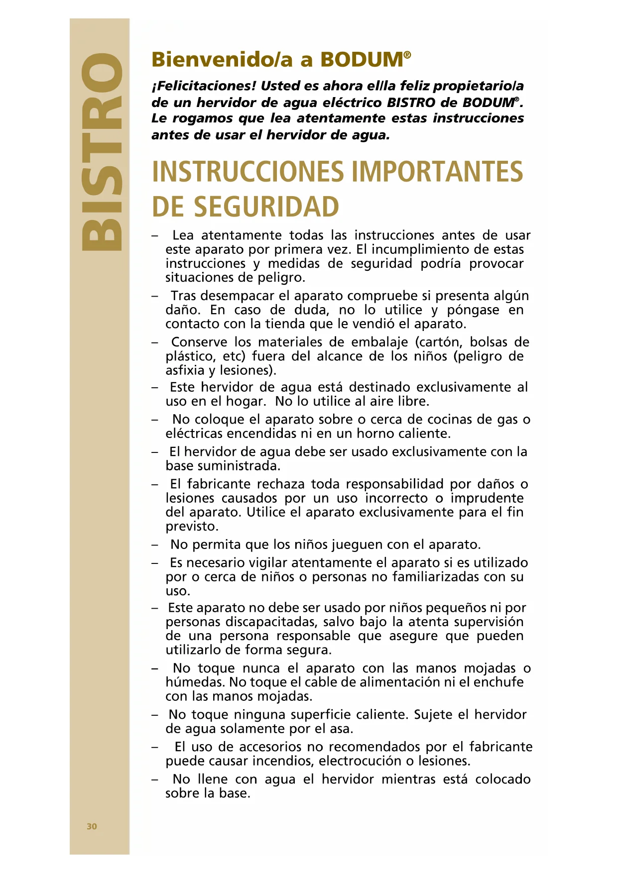 ¡Felicitaciones! Usted es ahora el/la feliz propietario/a de un hervidor de agua eléctrico BISTRO de BODUM