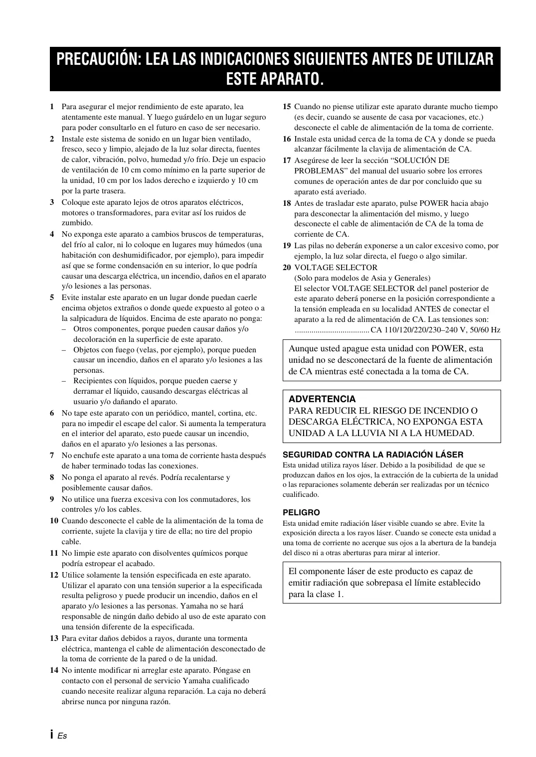 1 Para asegurar el mejor rendimiento de este aparato, lea atentamente este manual. Y luego guárdelo en un lugar seguro para poder consultarlo en el futuro en caso de ser necesario. 2 Instale este sistema de sonido en un lugar bien ventilado, fresco, seco y limpio, alejado de la luz solar directa, fuentes de calor, vibración, polvo, humedad y/o frío. Deje un espacio de ventilación de 10 cm como mínimo en la parte superior de la unidad, 10 cm por los lados derecho e izquierdo y 10 cm por la parte trasera. 3 Coloque este aparato lejos de otros aparatos eléctricos, motores o transformadores, para evitar así los ruidos de zumbido. 4 No exponga este aparato a cambios bruscos de temperaturas, del frío al calor, ni lo coloque en lugares muy húmedos (una habitación con deshumidificador, por ejemplo), para impedir así que se forme condensación en su interior, lo que podría causar una descarga eléctrica, un incendio, daños en el aparato y/o lesiones a las personas. 5 Evite instalar este aparato en un lugar donde puedan caerle encima objetos extraños o donde quede expuesto al goteo o a la salpicadura de líquidos. Encima de este aparato no ponga: – Otros componentes, porque pueden causar daños y/o decoloración en la superficie de este aparato. – Objetos con fuego (velas, por ejemplo), porque pueden causar un incendio, daños en el aparato y/o lesiones a las personas. – Recipientes con líquidos, porque pueden caerse y derramar el líquido, causando descargas eléctricas al usuario y/o dañando el aparato. 6 No tape este aparato con un periódico, mantel, cortina, etc. para no impedir el escape del calor. Si aumenta la temperatura en el interior del aparato, esto puede causar un incendio, daños en el aparato y/o lesiones a las personas. 7 No enchufe este aparato a una toma de corriente hasta después de haber terminado todas las conexiones. 8 No ponga el aparato al revés. Podría recalentarse y posiblemente causar daños. 9 No utilice una fuerza excesiva con los conmutadores, los controles y/o los cables. 10 Cuando desconecte el cable de la alimentación de la toma de corriente, sujete la clavija y tire de ella; no tire del propio cable. 11 No limpie este aparato con disolventes químicos porque podría estropear el acabado. 12 Utilice solamente la tensión especificada en este aparato. Utilizar el aparato con una tensión superior a la especificada resulta peligroso y puede producir un incendio, daños en el aparato y/o lesiones a las personas. Yamaha no se hará responsable de ningún daño debido al uso de este aparato con una tensión diferente de la especificada. 13 Para evitar daños debidos a rayos, durante una tormenta eléctrica, mantenga el cable de alimentación desconectado de la toma de corriente de la pared o de la unidad. 14 No intente modificar ni arreglar este aparato. Póngase en contacto con el personal de servicio Yamaha cualificado cuando necesite realizar alguna reparación. La caja no deberá abrirse nunca por ninguna razón.