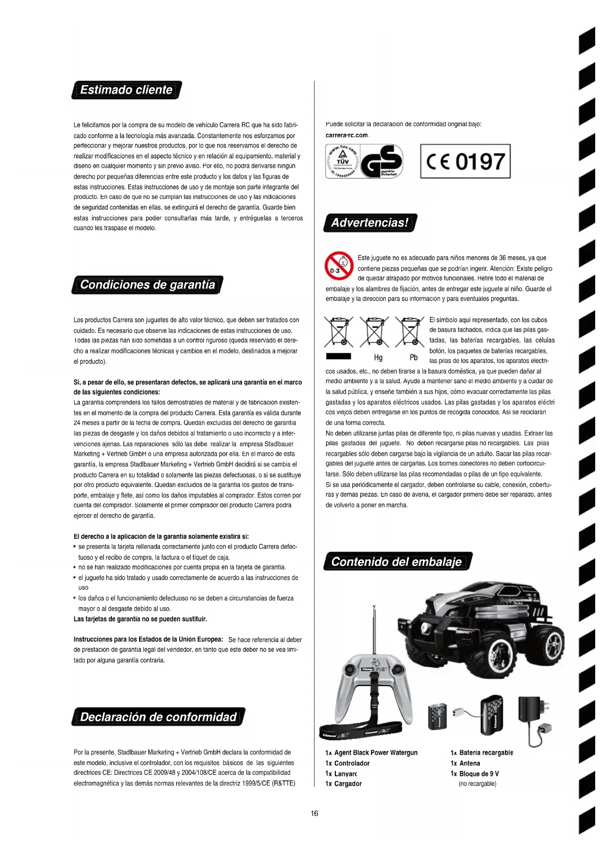 los daños o el funcionamiento defectuoso no se deben a circunstancias de fuerza mayor o al desgaste debido al uso. Las tarjetas de garantía no se pueden sustituir. Instrucciones para los Estados de la Unión Europea: Se hace referencia al deber de prestación de garantía legal del vendedor, en tanto que este deber no se vea limi- tado por alguna garantía contraria. Declaración de conformidad Por la presente, Stadlbauer Marketing + Vertrieb GmbH declara la conformidad de este modelo, inclusive el controlador, con los requisitos básicos de las siguientes directrices CE: Directrices CE 2009/48 y 2004/108/CE acerca de la compatibilidad electromagnética y las demás normas relevantes de la directriz 1999/5/CE (R&TTE) Puede solicitar la declaración de conformidad original bajo: carrera