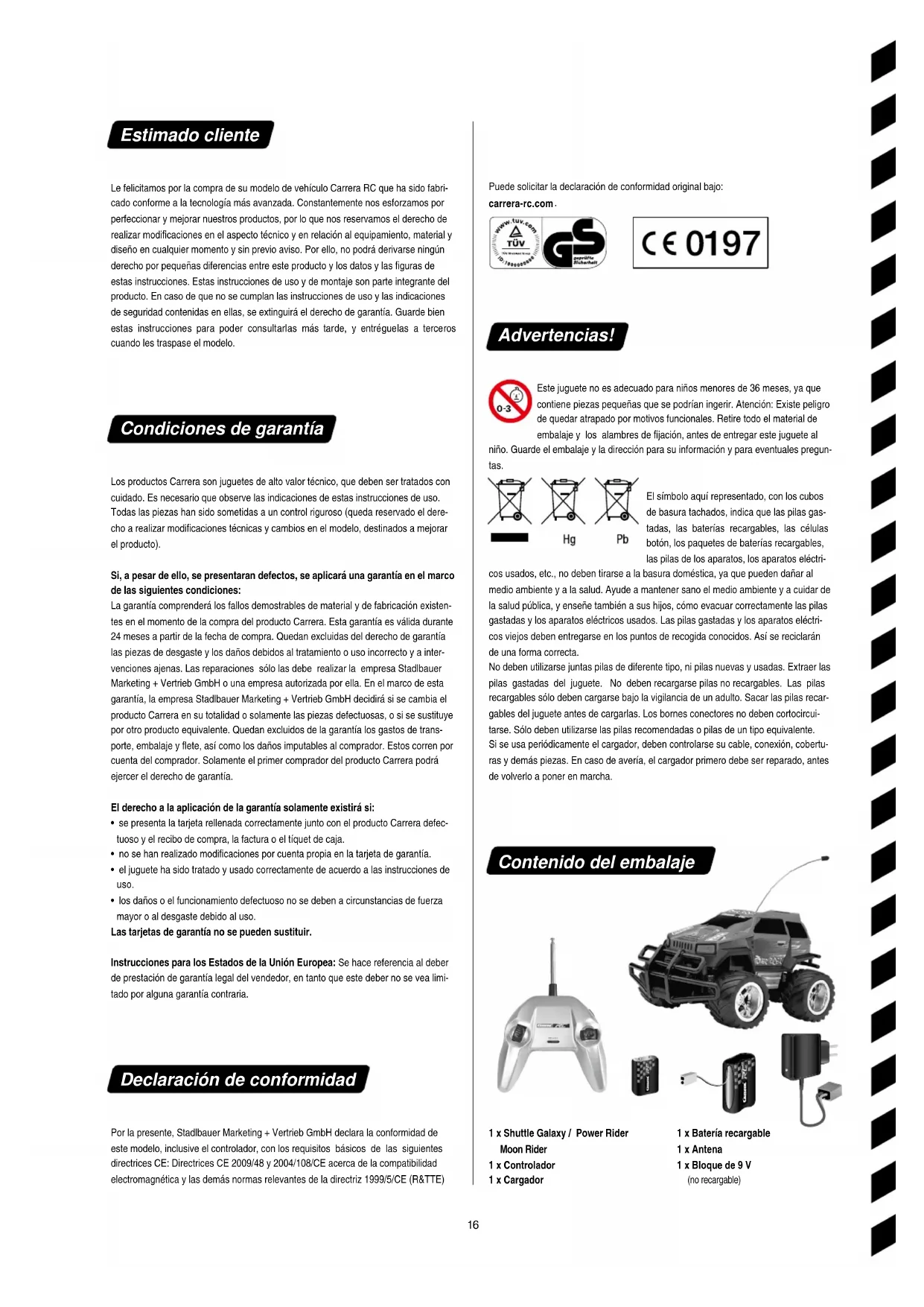 Advertencias! Este juguete no es adecuado para niños menores de 36 meses, ya que contiene piezas pequeñas que se podrían ingerir. Atención: Existe peligro de quedar atrapado por motivos funcionales. Retire todo el material de embalaje y los alambres de jación, antes de entregar este juguete al niño. Guarde el embalaje y la dirección para su información y para eventuales pregun- tas. El símbolo aquí representado, con los cubos de basura tachados, indica que las pilas gas- tadas, las baterías recargables, las células botón, los paquetes de baterías recargables, las pilas de los aparatos, los aparatos eléctri- cos usados, etc., no deben tirarse a la basura doméstica, ya que pueden dañar al medio ambiente y a la salud. Ayude a mantener sano el medio ambiente y a cuidar de la salud pública, y enseñe también a sus hijos, cómo evacuar correctamente las pilas gastadas y los aparatos eléctricos usados. Las pilas gastadas y los aparatos eléctri- cos viejos deben entregarse en los puntos de recogida conocidos. Así se reciclarán de una forma correcta. No deben utilizarse juntas pilas de diferente tipo, ni pilas nuevas y usadas. Extraer las pilas gastadas del juguete. No deben recargarse pilas no recargables. Las pilas recargables sólo deben cargarse bajo la vigilancia de un adulto. Sacar las pilas recar- gables del juguete antes de cargarlas. Los bornes conectores no deben cortocircui- tarse. Sólo deben utilizarse las pilas recomendadas o pilas de un tipo equivalente. Si se usa periódicamente el cargador, deben controlarse su cable, conexión, cobertu- ras y demás piezas. En caso de avería, el cargador primero debe ser reparado, antes de volverlo a poner en marcha. Contenido del embalaje 1 x Shuttle Galaxy / Power Rider Moon Rider 1 x Controlador 1 x Cargador 1 x Batería recargable 1 x Antena 1 x Bloque de 9 V (no recargable)1