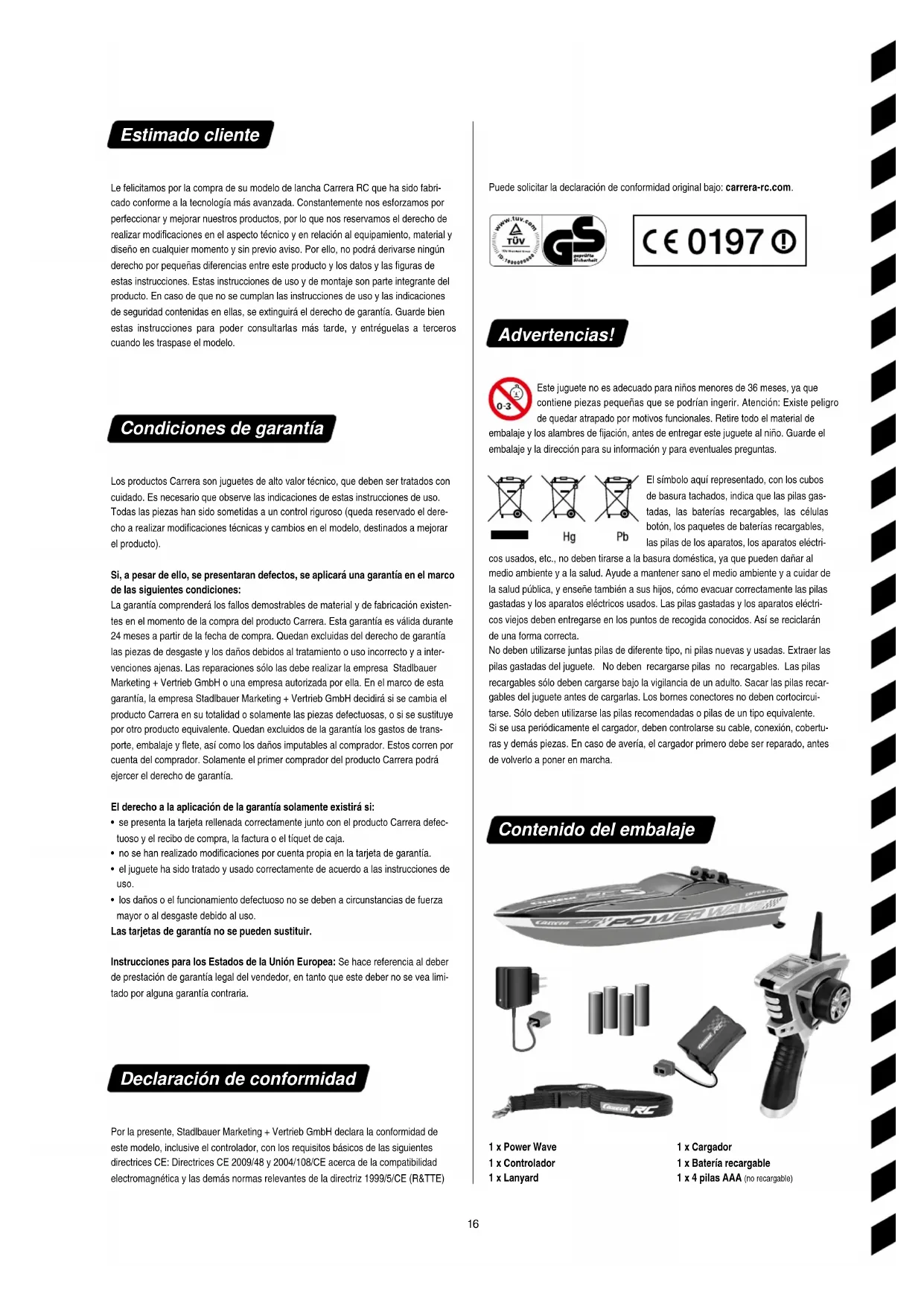 - los daños o el funcionamiento defectuoso no se deben a circunstancias de fuerza mayor o al desgaste debido al uso. Las tarjetas de garantía no se pueden sustituir. Instrucciones para los Estados de la Unión Europea: Se hace referencia al deber de prestación de garantía legal del vendedor, en tanto que este deber no se vea limi- tado por alguna garantía contraria. Declaración de conformidad Por la presente, Stadlbauer Marketing + Vertrieb GmbH declara la conformidad de este modelo, inclusive el controlador, con los requisitos básicos de las siguientes directrices CE: Directrices CE 2009/48 y 2004/108/CE acerca de la compatibilidad electromagnética y las demás normas relevantes de la directriz 1999/5/CE (R&TTE) Puede solicitar la declaración de conformidad original bajo: carrerarc.com. Advertencias! Este juguete no es adecuado para niños menores de 36 meses, ya que contiene piezas pequeñas que se podrían ingerir. Atención: Existe peligro de quedar atrapado por motivos funcionales. Retire todo el material de embalaje y los alambres de jación, antes de entregar este juguete al niño. Guarde el embalaje y la dirección para su información y para eventuales preguntas. El símbolo aquí representado, con los cubos de basura tachados, indica que las pilas gas- tadas, las baterías recargables, las células botón, los paquetes de baterías recargables, las pilas de los aparatos, los aparatos eléctri- cos usados, etc., no deben tirarse a la basura doméstica, ya que pueden dañar al medio ambiente y a la salud. Ayude a mantener sano el medio ambiente y a cuidar de la salud pública, y enseñe también a sus hijos, cómo evacuar correctamente las pilas gastadas y los aparatos eléctricos usados. Las pilas gastadas y los aparatos eléctri- cos viejos deben entregarse en los puntos de recogida conocidos. Así se reciclarán de una forma correcta. No deben utilizarse juntas pilas de diferente tipo, ni pilas nuevas y usadas. Extraer las pilas gastadas del juguete. No deben recargarse pilas no recargables. Las pilas recargables sólo deben cargarse bajo la vigilancia de un adulto. Sacar las pilas recar- gables del juguete antes de cargarlas. Los bornes conectores no deben cortocircui- tarse. Sólo deben utilizarse las pilas recomendadas o pilas de un tipo equivalente. Si se usa periódicamente el cargador, deben controlarse su cable, conexión, cobertu- ras y demás piezas. En caso de avería, el cargador primero debe ser reparado, antes de volverlo a poner en marcha. Contenido del embalaje 1 x Power Wave 1 x Controlador 1 x Lanyard 1 x Cargador 1 x Batería recargable 1 x 4 pilas AAA (no recargable)17