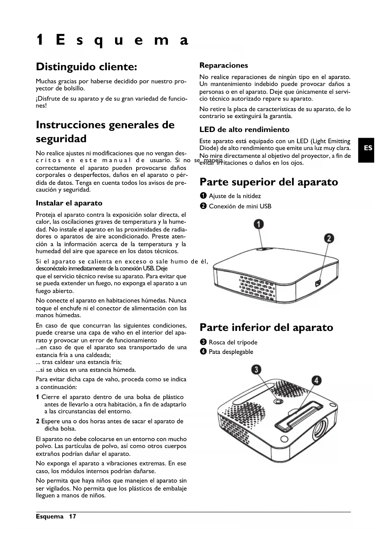 1Esquema Distinguido cliente: Muchas gracias por haberse decidido por nuestro pro- yector de bolsillo. ¡Disfrute de su aparato y de su gran variedad de funcio- nes! Instrucciones generales de seguridad Introducción 2 No realice ajustes ni modificaciones que no vengan des- critos en este manual de usuario. Si no se maneja correctamente el aparato pueden provocarse daños corporales o desperfectos, daños en el aparato o pér- dida de datos. Tenga en cuenta todos los avisos de pre- caución y seguridad. Instalar el aparato Proteja el aparato contra la exposición solar directa Proteja el aparato contra la exposición solar directa, el calor, las oscilaciones graves de temperatura y la hume- dad. No instale el aparato en las proximidades de radia- dores o aparatos de aire acondicionado. Preste aten- ción a la información acerca de la temperatura y la humedad del aire que aparece en los datos técnicos. Si el aparato se calienta en exceso o sale humo de él (USB) Si el aparato se calienta en exceso o sale humo de él, desconéctelo inmediatamente de la conexión USB. Deje que el servicio técnico revise su aparato. Para evitar que se pueda extender un fuego, no exponga el aparato a un fuego abierto. No conecte el aparato en habitaciones húmedas. No conecte el aparato en habitaciones húmedas. Nunca toque el enchufe ni el conector de alimentación con las manos húmedas. Capa de vaho En caso de que concurran las siguientes condiciones, puede crearse una capa de vaho en el interior del apa- rato y provocar un error de funcionamiento ...en caso de que el aparato sea transportado de una estancia fría a una caldeada; ... tras caldear una estancia fría; ...si se ubica en una estancia húmeda. Para evitar dicha capa de vaho, proceda como se indica a continuación: 1 Cierre el aparato dentro de una bolsa de plástico antes de llevarlo a otra habitación, a fin de adaptarlo a las circunstancias del entorno. 2 Espere una o dos horas antes de sacar el aparato de dicha bolsa. El aparato no deb e colocarse en un entorno con mucho polvo. El aparato no debe colocarse en un entorno con mucho polvo. Las partículas de polvo, así como otros cuerpos extraños podrían dañar el aparato. No exponga el aparato a vibraciones extremas. No exponga el aparato a vibraciones extremas. En ese caso, los módulos internos podrían dañarse. No permita que haya niños que manejen el aparato sin ser vigilados. No permita que haya niños que manejen el aparato sin ser vigilados. No permita que los plásticos de embalaje lleguen a manos de niños. Reparaciones Reparaciones No realice reparaciones de ningún tipo en el aparato. Un mantenimiento indebido puede provocar daños a personas o en el aparato. Deje que únicamente el servi- cio técnico autorizado repare su aparato. No retire la placa de características de su aparato, de lo contrario se extinguirá la garantía. LED de alto rendimiento Este aparato está equipado con un LED (Light Emitting Diode) de alto rendimiento que emite una luz muy clara. No mire directamente al objetivo del proyector, a fin de evitar irritaciones o daños en los ojos. Parte superior del aparato ‚ Ajuste de la nitidez ƒ Conexión de mini USB PicoPix P1 oben Parte inferior del aparato „ Rosca del trípode … Pata desplegable PicoPix P1 unten ppx1020_manual_06_es_253345797-b.book Seite 17 Freitag, 17. September 2010 11:50 1118 Philips · PPX1020