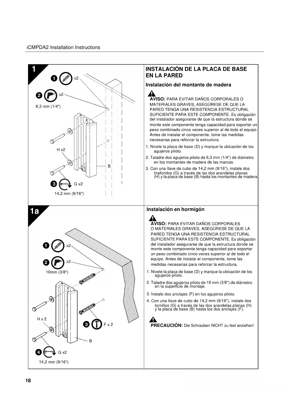 tornillos (G) a través de las dos arandelas planas (H) y la placa de base (B) hasta los dos anclajes (F). PRECAUCIÓN: Die Schrauben NICHT zu fest anziehen!