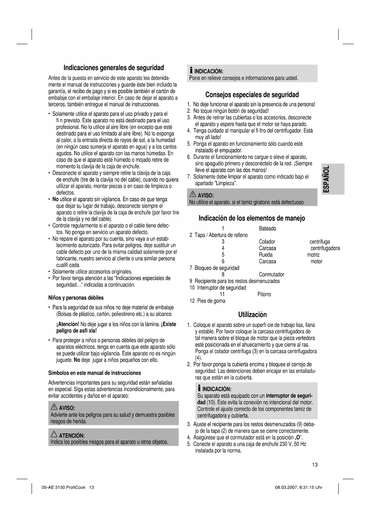 - El aparato no tiene función Remedio: Supervise la conexión a la red. Supervise la posición del interruptor. Otras posibles causas: Su aparato está equipado con un interruptor de seguridad (10). Este evita la conexión no intencional del motor. Remedio: Controle el ajuste correcto de los componentes tamiz de centrifugadora y cubierta. Datos técnicos Modelo: ............................................................................AE 3150 Suministro de tensión: ..................................220-240 V, 50/60 Hz Consumo de energía: ..................................................500-700 W Clase de protección: ................................................................... ΙΙ Intervalo de corto funcionamiento:.......................................3 Min. Este aparato se ha examinado según las normativas actuales y vigentes de la Comunidad Europea, como p.ej. compati- bilidad electromagnética y directiva de baja tensión y se ha construido según las más nuevas especifi caciones en razón de la seguridad. No reservamos el derecho de efectuar modifi caciones técnicas. 05-AE 3150 ProfiCook 14 08.03.2007, 8:31:18 Uhr15 ESPAÑOL ESPAÑOL Garantía Para el aparato comercializado por nosotros nos responsabi- lizamos con una garantía de 24 meses a partir de la fecha de compra (factura de compra). Durante el período de garantía nos encargamos gratuítamente de los defectos del aparato y de los accesorios, que se hayan originado por defectos del material o de la fabricación. Depen- diendo de nuestra estimación se realizará una reparación o un cambio. ¡Los servicios de garantía no prolangan la garantía, ni se incia por ello un período nuevo de garantía! Como comprobante para la garantía es válido la factura de compra. Sin este comprobante no se podrá realizar un cambio o una reparación gratuíta. En caso de garantía entregue el aparato completo en su emba- laje original junto con la factura a su agente comerciante. ¡Defectos en los accesorios de uso o en las piezas de desgaste, como también la limpieza, mantenimiento o el recambio de piezas de desgaste no recaen en la garantía e irán al cargo del cliente! En caso de intervención ajena se expira la garantía. Después de la garantía Después de haber expirado la garantía se pueden realizar las reparaciones por el concesionario o por el servicio de reparacio- nes. Los gastos irán al cargo del cliente. Signifi cado del símbolo „Cubo de basura“ Proteja nuestro medio ambiente, aparatos eléctricos no forman parte de la basura doméstica. Haga uso de los centros de recogida previstos para la eliminación de aparatos eléctricos y entregue allí sus aparatos eléctricos que no vaya a utilizar más. Ayudará en evitar las potenciales consecuencias, a causa de una erronéa eliminación de desechos, para el medio ambiente y la salud humana. Con ello, contribuirá a la recuperación, al reciclado y a otras formas de reutilización de los aparatos viejos eléctricos y electrónicos. La información cómo se debe eliminar los aparatos, se obtiene en su ayuntamiento o su administración municipal. 05-AE 3150 ProfiCook 15 08.03.2007, 8:31:20 Uhr16 PORTUGUÊS PORTUGUÊS Instruções gerais de segurança Antes de pôr este aparelho a funcionar, leia muito atentamente as instruções de emprego e guarde-as muito bem, juntamente com o talão de garantia, o talão de compra e, tanto quanto possível, a embalagem com os elementos interiores. Se puser o aparelho à disposição de terceiros, entregue-lhes também as Instruções de Utilização.