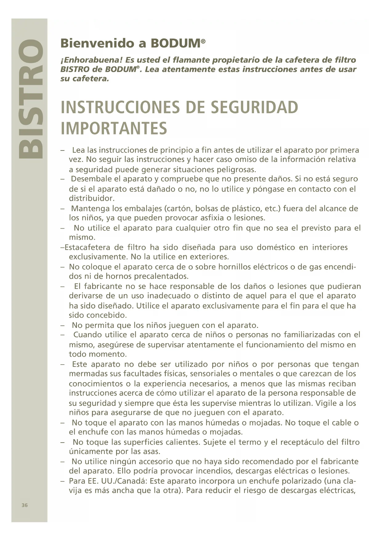 IMPORTANTES – Lea las instrucciones de principio a fin antes de utilizar el aparato por primera vez. No seguir las instrucciones y hacer caso omiso de la información relativa a seguridad puede generar situaciones peligrosas. – Desembale el aparato y compruebe que no presente daños. Si no está seguro de si el aparato está dañado o no, no lo utilice y póngase en contacto con el distribuidor. – Mantenga los embalajes (cartón, bolsas de plástico, etc.) fuera del alcance de los niños, ya que pueden provocar asfixia o lesiones. – No utilice el aparato para cualquier otro fin que no sea el previsto para el mismo. – Esta cafetera de filtro ha sido diseñada para uso doméstico en interiores exclusivamente. No la utilice en exteriores. – No coloque el aparato cerca de o sobre hornillos eléctricos o de gas encendi- dos ni de hornos precalentados. – El fabricante no se hace responsable de los daños o lesiones que pudieran derivarse de un uso inadecuado o distinto de aquel para el que el aparato ha sido diseñado. Utilice el aparato exclusivamente para el fin para el que ha sido concebido. – No permita que los niños jueguen con el aparato. – Cuando utilice el aparato cerca de niños o personas no familiarizadas con el mismo, asegúrese de supervisar atentamente el funcionamiento del mismo en todo momento. – Este aparato no debe ser utilizado por niños o por personas que tengan mermadas sus facultades físicas, sensoriales o mentales o que carezcan de los conocimientos o la experiencia necesarios, a menos que las mismas reciban instrucciones acerca de cómo utilizar el aparato de la persona responsable de su seguridad y siempre que ésta les supervise mientras lo utilizan. Vigile a los niños para asegurarse de que no jueguen con el aparato. – No toque el aparato con las manos húmedas o mojadas. No toque el cable o el enchufe con las manos húmedas o mojadas. – No toque las superficies calientes. Sujete el termo y el receptáculo del filtro únicamente por las asas. – No utilice ningún accesorio que no haya sido recomendado por el fabricante del aparato. Ello podría provocar incendios, descargas eléctricas o lesiones. – Para EE. UU./Canadá: Este aparato incorpora un enchufe polarizado (una cla- vija es más ancha que la otra). Para reducir el riesgo de descargas eléctricas,37 InstruccIones De uso este enchufe sólo puede introducirse en una posición determinada en tomas polarizadas. Si no encaja perfectamente en la toma, déle la vuelta. Si aún así no consigue introducirlo sin forzarlo, póngase en contacto con un electricista cualificado. No modifique el enchufe de ninguna forma. – Antes de encender el aparato, compruebe que el mismo tenga agua. – Al llenar el depósito (2), cuide de que el nivel de agua no supere la línea marcada con MAX. – No encienda nunca el aparato sin el difusor (11) y el receptáculo del filtro (6) instalados. – Evite el contacto con el vapor que se genera durante el proceso de elabora- ción. De lo contrario, corre el riesgo de escaldarse. – Pueden producirse quemaduras si se retira la tapa mientras el aparato está funcionando. – El agua hirviendo puede provocar quemaduras. – Asegúrese de que el botón ON/OFF (15) permanezca accesible en todo momento. – PRECAUCIÓN: para evitar que el aparato sufra daños, no utilice productos alcalinos para limpiarlo; en su lugar, utilice un paño húmedo y un detergente suave. – No sumerja nunca la cafetera en agua. Recuerde que se trata de un aparato eléctrico. – Limpie la carcasa (1) únicamente con un paño húmedo. – Pulse el botón ON/OFF (15) y desconecte el enchufe de la toma a fin de apa- gar el aparato. – Para desenchufar el aparato de la toma de corriente, tire siempre del enchu- fe, nunca del cable. – No deje el cable colgando por el borde de mesas o encimeras ni permita que entre en contacto con superficies calientes. – Desenchufe el aparato de la toma de corriente si no está utilizando la cafete- ra o si va a limpiarla. Deje que el aparato se enfríe antes de retirar las piezas para limpiarlo. – No ponga nunca en marcha el aparato eléctrico si el cable de alimentación o el enchufe están deteriorados, si se ha producido un funcionamiento inco- rrecto o si el aparato ha sufrido algún daño. En tales casos, lleve el aparato al centro autorizado más cercano para su revisión, reparación o ajuste. – No intente nunca cambiar el cable de alimentación del aparato; para ello son necesarias herramientas especiales. Encargue la reparación del aparato o la sustitución del cable de alimentación a un centro autorizado por el fabrican- te para asegurarse de que el aparato reciba el trato adecuado. – No sumerja el cable, el enchufe o el aparato en agua u otros líquidos, ya que podría provocar un incendio, una descarga eléctrica o lesiones. – Antes de utilizar el aparato, asegúrese de que la superficie sobre la que está colocado esté seca. – Coloque siempre la cubierta de la carcasa (5), el receptáculo del filtro (6) y el filtro de café (7) en el aparato antes de utilizarlo.38 BIstro InstALAcIÓn – Coloque el aparato en una superficie estable y nivelada que no esté caliente ni se encuentre cerca de una fuente de calor. Además, asegúrese de que esté completamente seca. Mantenga el aparato y el cable fuera del alcance de los niños. – Cuando use la cafetera de filtro, no coloque nunca la carcasa (1) sobre una bandeja o cualquier otra superficie metálica. – Compruebe que la placa de identificación del aparato indica un voltaje acor- de con la tensión de la red de suministro eléctrico. Conecte el aparato úni- camente a un enchufe con toma de tierra debidamente instalado que tenga una corriente de salida de al menos 6 A. (Utilice un disyuntor de corriente residual [RCD]. Si es necesario, pida ayuda a un electricista.). Mientras el aparato está funcionando, es necesario que el enchufe esté accesible por si se produjera algu