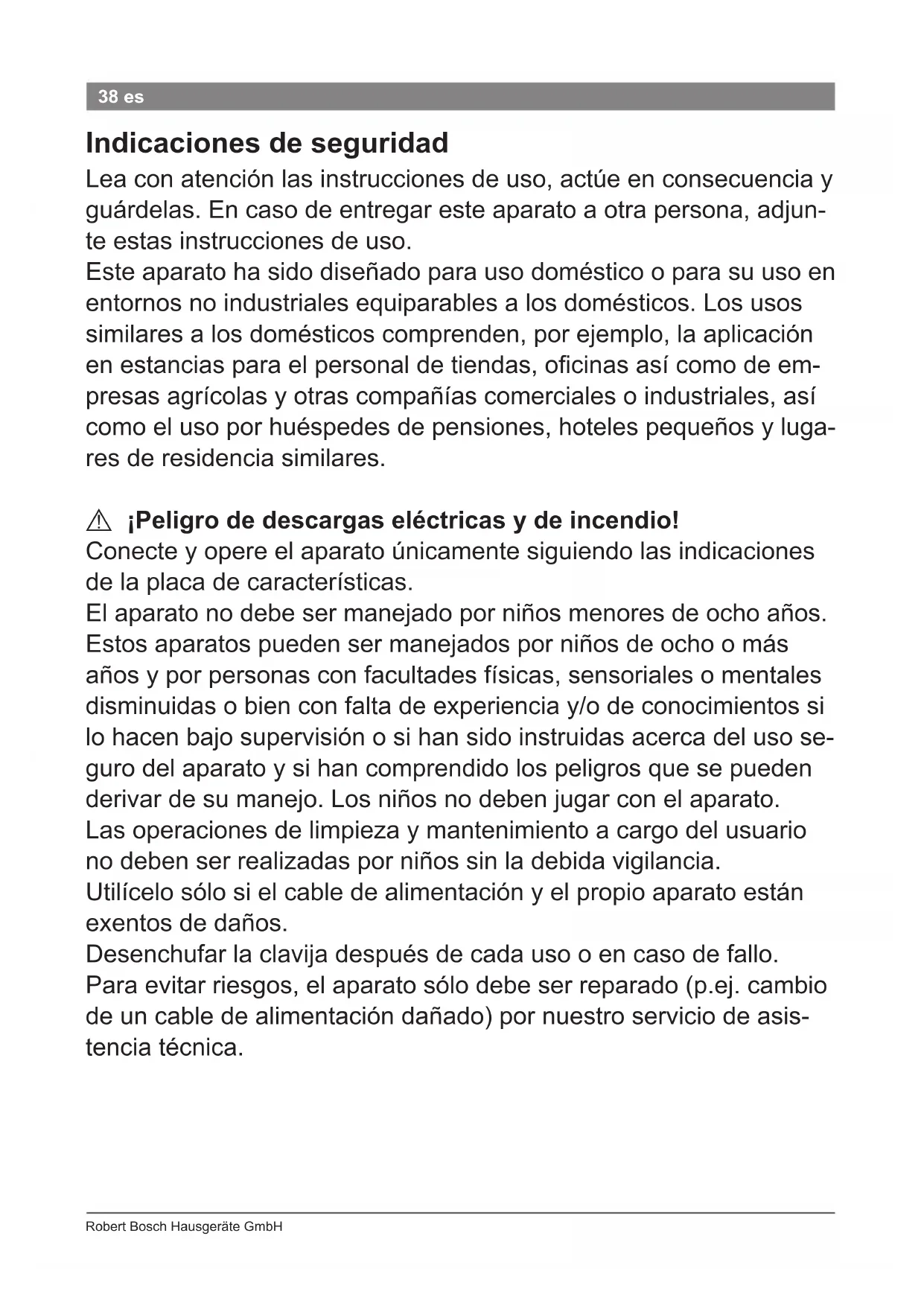 ¡Peligro de electrocución! Antes de limpiar, desenchufar la clavija. No sumergir nunca el aparato en agua. No utilizar ningún limpiador de vapor. ● Limpiar el aparato externamente sólo con un paño húmedo y secar a conti- nuación. No utilizar limpiadores fuertes o abrasivos. Datos técnicos Conexión eléctrica (tensión / frecuencia) 220-240 V / 50 Hz Potencia 31 W Eliminación Elimine el embalaje respetando el medio ambiente. Este aparato está señalizado se- gún la Directiva Europea 2002/96/CE sobre aparatos eléctricos y electrónicos antiguos (material residual eléctrico y electrónico – WEEE). La Directiva proporciona el marco para el reciclaje y aprovechamiento de apa- ratos antiguos a nivel de toda la UE. Infórmese sobre las vías de eliminación ac- tuales en su distribuidor. Modicaciones reservadas. A42 Robert Bosch Hausgeräte GmbH 42 es Garantía