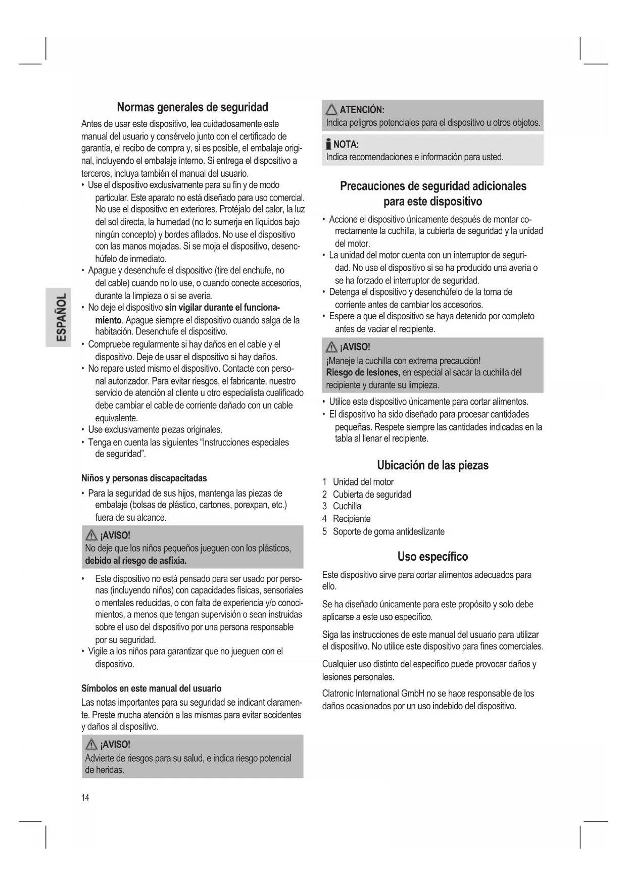 - El dispositivo ha sido diseñado para procesar cantidades pequeñas. Respete siempre las cantidades indicadas en la tabla al llenar el recipiente. Ubicación de las piezas 1 Unidad del motor 2 Cubierta de seguridad 3 Cuchilla 4 Recipiente 5 Soporte de goma antideslizante Uso especíco Este dispositivo sirve para cortar alimentos adecuados para ello. Se ha diseñado únicamente para este propósito y solo debe aplicarse a este uso especíco. Siga las instrucciones de este manual del usuario para utilizar el dispositivo. No utilice este dispositivo para nes comerciales. Cualquier uso distinto del especíco puede provocar daños y lesiones personales. Clatronic International GmbH no se hace responsable de los daños ocasionados por un uso indebido del dispositivo.15 Desembalaje del dispositivo