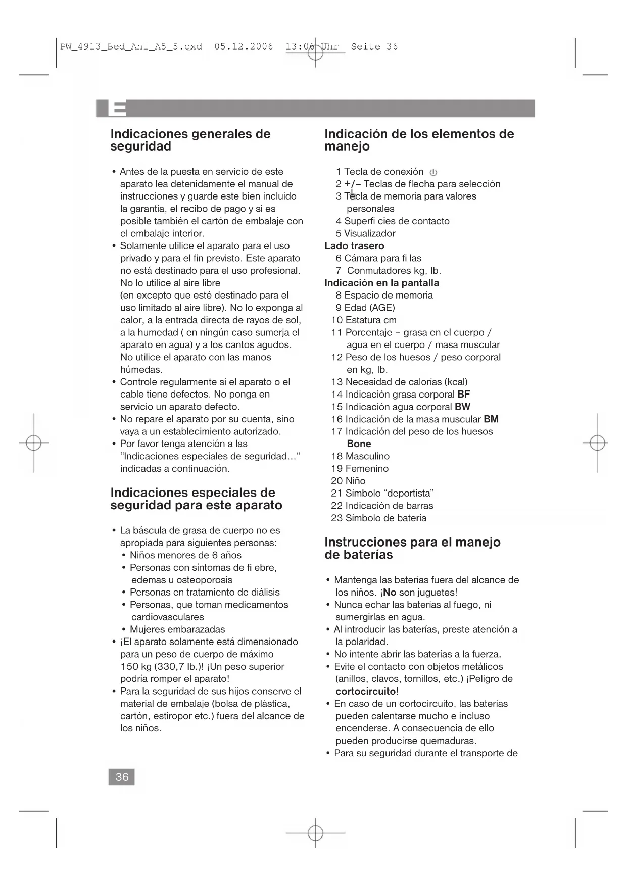 - No se deben emplear tipos de batería desiguales ni baterías nuevas y usadas juntas. Cuidado: Las baterías no se colocan en el aseo domiciliario. Por favor, entregue las baterías utilizadas en los lugares de recolección o en los negocios donde las venden. Nunca arroje baterías al fuego. Cámara para fi las (Parte posterior de la báscula) Ambas pilas en la cámara están envueltas en una hoja delgada para el transporte seguro. Esto alarga la duración de las pilas. Antes del primer uso retire por favor la lámina para poder poner la báscula en funcionamiento. Información acerca de la medición de la grasa del cuerpo Personas que tengan un marcapasos u otra implantación médica con componentes electrónicos, desaconsejamos usar esta báscula. Con ello, se puede arriesgar o perjudicar la efi cacia de la implantación. ¡El aparato solamente puede funcionar de forma correcta, si se pone sobre las superfi cies de contacto descalzo y con los pies secos! El principio básico de este aparato se basa en la medición de la impedancia eléctrica del cuerpo. Para esto el aparato deja correr por su cuerpo una débil señal eléctrica que no se siente. De esta forma se puede calcular los valores actuales del cuerpo. ¡La señal por lo general no es peligrosa! ¡No obstante, contemple para ello nuestras indicaciones especiales de segurid d! La medición es conocida bajo el concepto „Análisis de impedancia bioelectrónica“ (BIA), un factor, que depende del porcentaje de grasa y agua corporal y que está relacionado con otros datos biológicos (Edad, sexo, estatura). Hay personas obesas que tienen una relación equilibrada entre su masa de grasa y su masa muscular y hay personas delgadas con PW_4913_Bed_Anl_A5_5.qxd 05.12.2006 13:06 Uhr Seite 3738