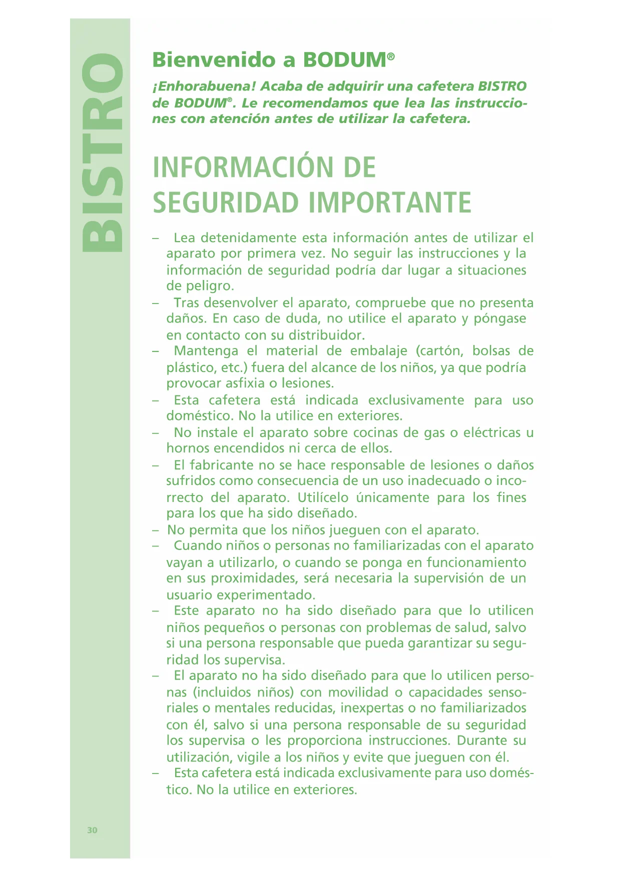 ofrece dos años de garantía desde la fecha de compra de la cafetera “BISTRO” que cubre defectos en los materiales o problemas de funcionamiento derivados de deficiencias en el diseño o la fabricación. Las reparaciones del aparato se realizarán sin coste siempre y cuando se cumplan todas las condiciones de la garantía. Sin embargo, no se realizarán devoluciones. Condiciones de garantía: el comprador deberá cumplimen- tar el certificado de garantía en el momento de la compra. La garantía BODUM