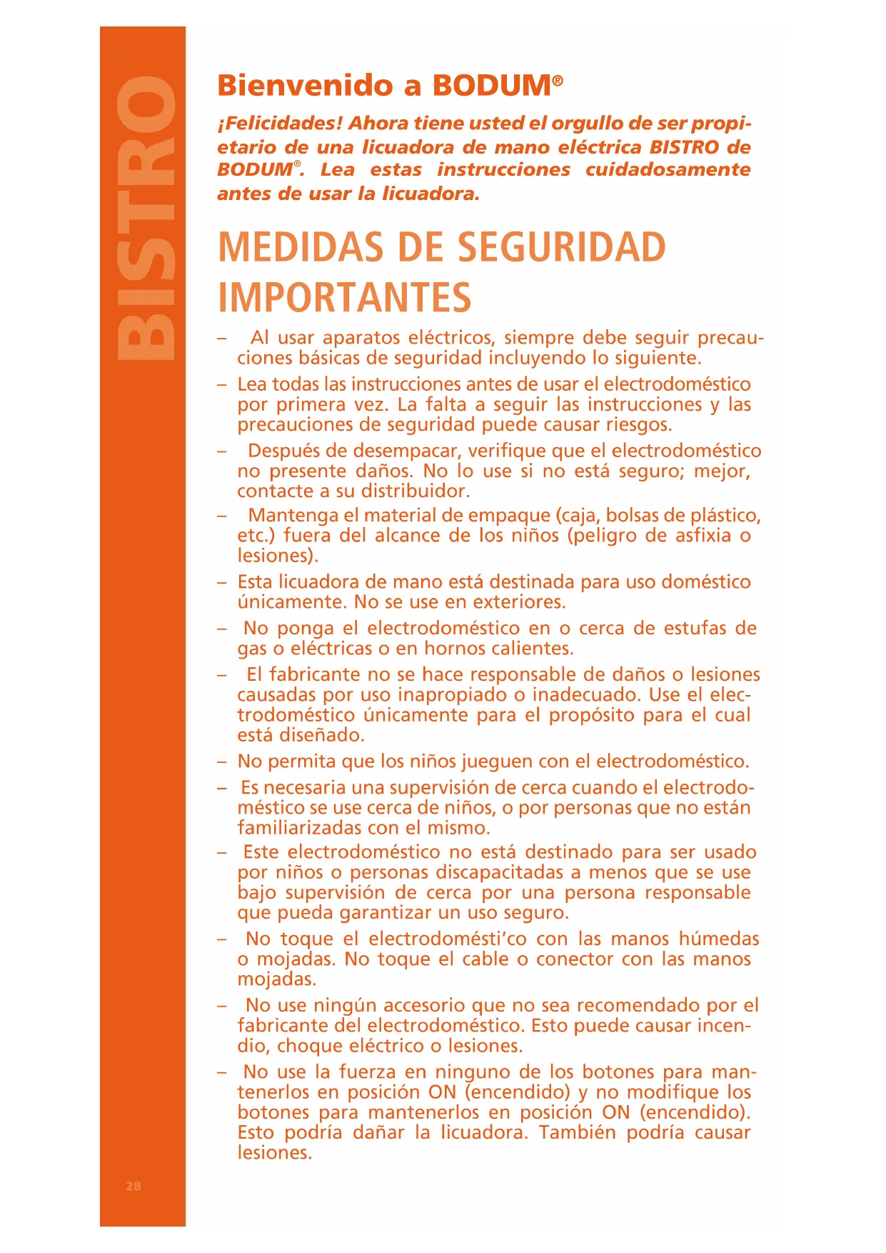 ¡Felicidades! Ahora tiene usted el orgullo de ser propi- etario de una licuadora de mano eléctrica BISTRO de BODUM