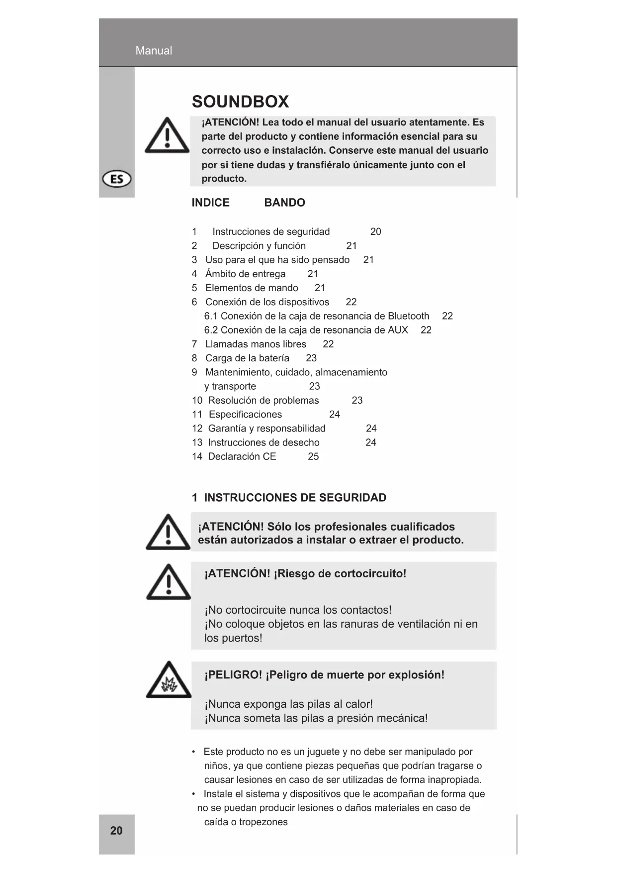 nom commercial déposé de Wentronic GmbH, déclare que l‘appareil est conforme aux conditions et directives de base de laréglementationeuropéenne.Vouspouvezconsulterlesitewww. cabstone.com pour de plus amples informations. Toutes les marques et marques déposées sont la propriété de leurs proprié- taires respectifs.20 Manual ¡ATENCIÓN! Lea todo el manual del usuario atentamente. Es parte del producto y contiene información esencial para su correcto uso e instalación. Conserve este manual del usuario por si tiene dudas y transéralo únicamente junto con el producto. SOUNDBOX INDICE BANDO 1 Instruccionesdeseguridad 20 2 Descripciónyfunción 21 3 Uso para el que ha sido pensado 21 4 Ámbito de entrega 21 5 Elementos de mando 21 6 Conexión de los dispositivos 22 6.1ConexióndelacajaderesonanciadeBluetooth 22 6.2ConexióndelacajaderesonanciadeAUX 22 7 Llamadas manos libres 22 8 Carga de la batería 23 9 Mantenimiento, cuidado, almacenamiento ytransporte 23 10 Resolución de problemas 23 11 Especicaciones 24 12Garantíayresponsabilidad 24 13Instruccionesdedesecho 24 14 Declaración CE 25