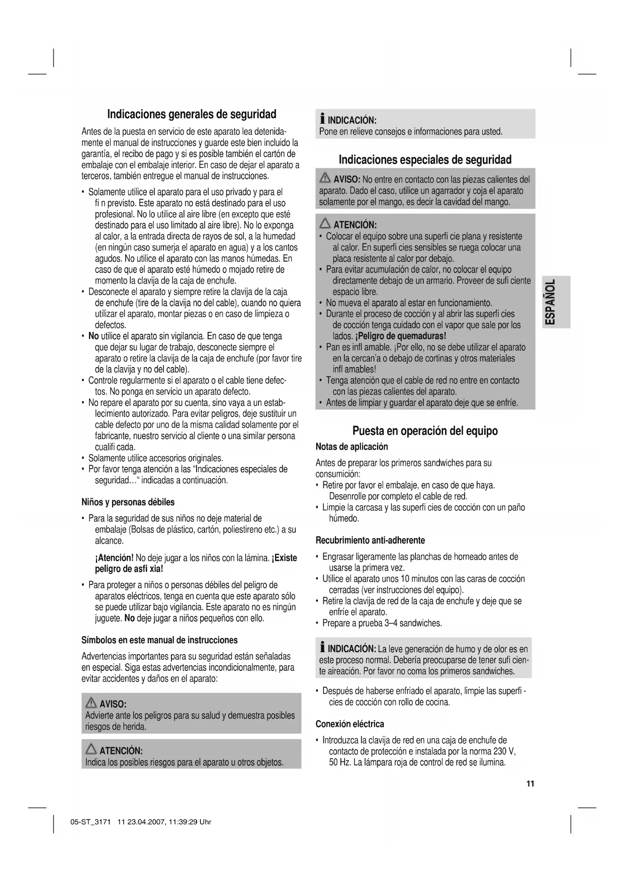 I INDICACIÓN: La leve generación de humo y de olor es en este proceso normal. Debería preocuparse de tener sufi ciente aireación. Por favor no coma los primeros sandwiches.