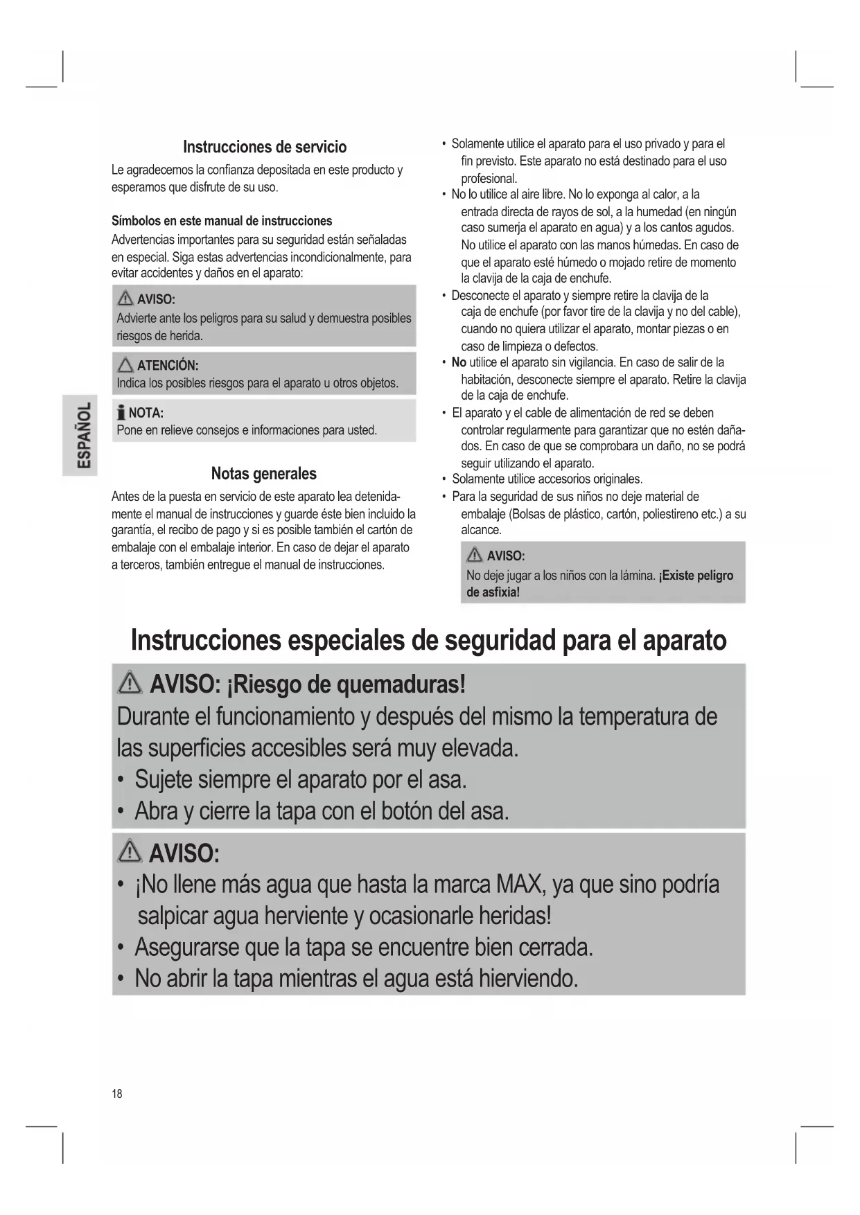 - Este aparato sirve para calentar y hervir agua. No utilice el aparato nunca para calentar otros líquidos o comida.