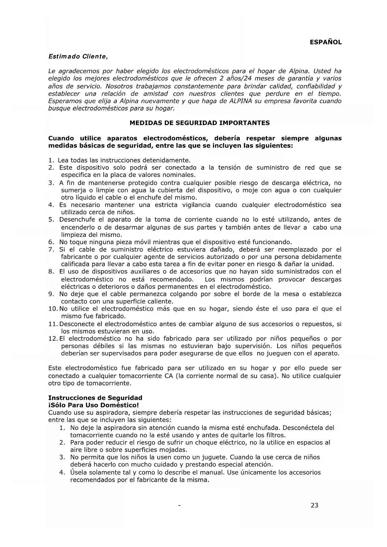 Estimado Cliente, Le agradecemos por haber elegido los electrodomésticos para el hogar de Alpina. Usted ha elegido los mejores electrodomésticos que le ofrecen 2 años/24 meses de garantía y varios años de servicio. Nosotros trabajamos constantemente para brindar calidad, confiabilidad y establecer una relación de amistad con nuestros clientes que perdure en el tiempo. Esperamos que elija a Alpina nuevamente y que haga de ALPINA su empresa favorita cuando busque electrodomésticos para su hogar.