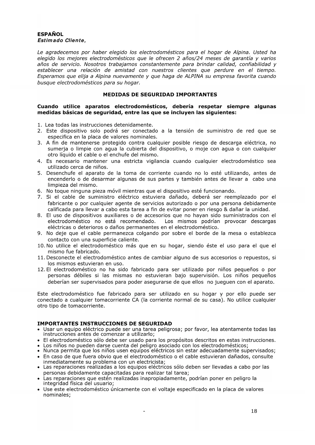 Estimado Cliente, Le agradecemos por haber elegido los electrodomésticos para el hogar de Alpina. Usted ha elegido los mejores electrodomésticos que le ofrecen 2 años/24 meses de garantía y varios años de servicio. Nosotros trabajamos constantemente para brindar calidad, confiabilidad y establecer una relación de amistad con nuestros clientes que perdure en el tiempo. Esperamos que elija a Alpina nuevamente y que haga de ALPINA su empresa favorita cuando busque electrodomésticos para su hogar.