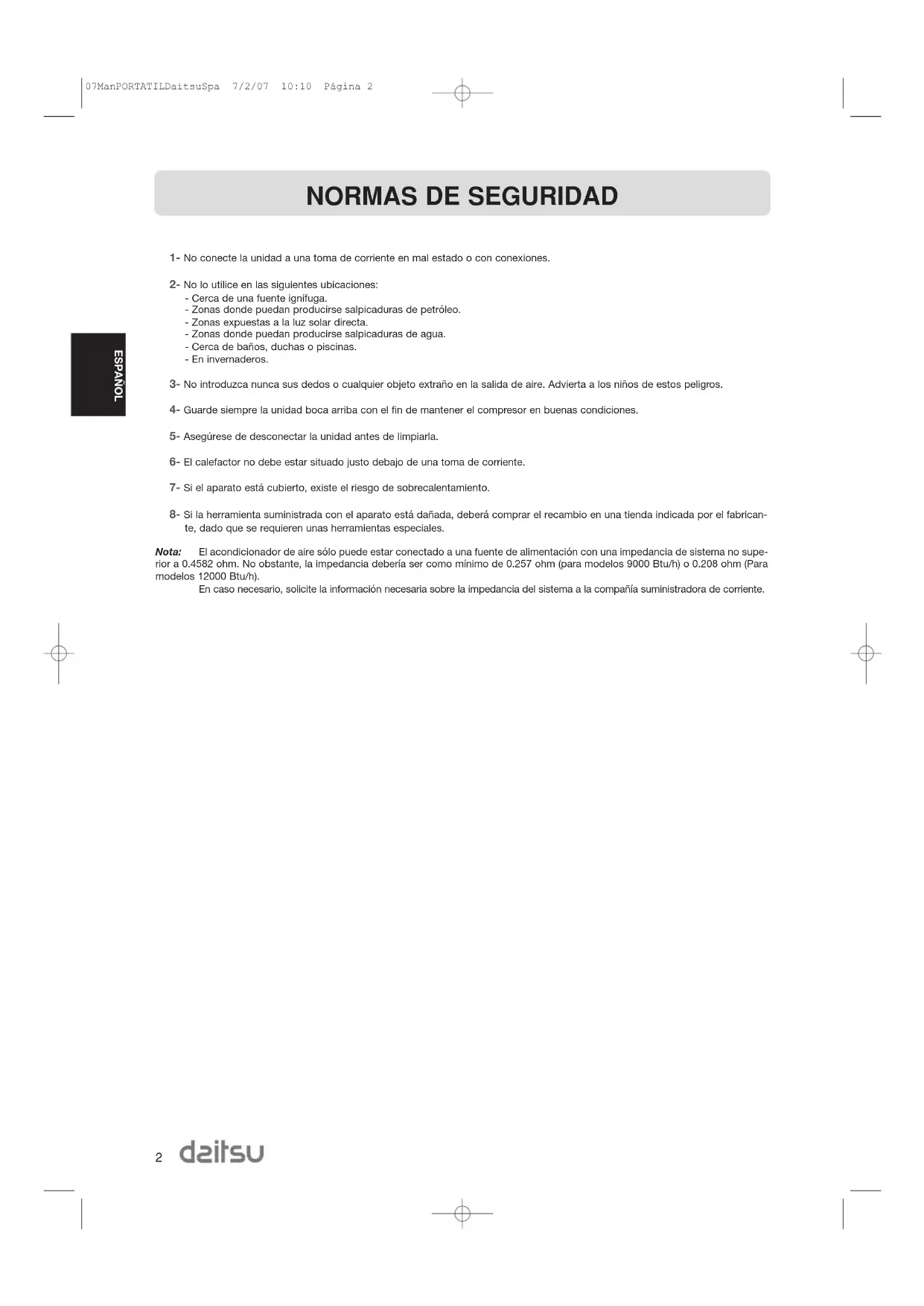 Seleccione la velocidad del ventilador entreALTA MEDIA o BAJA Tablero de mandos Tablero de mandos 07ManPORTATILDaitsuSpa 7/2/07 10:10 Página 4ESPAÑOL