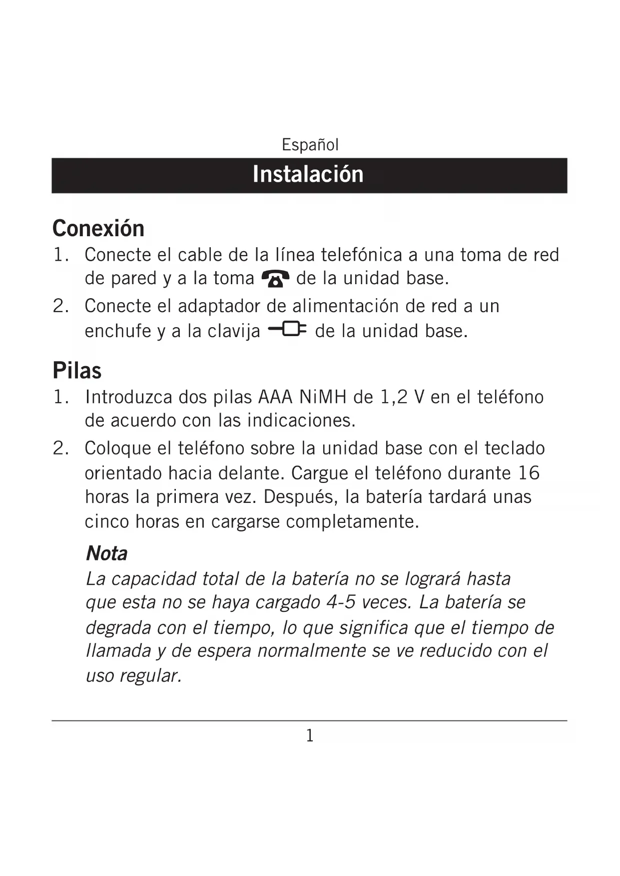 de la unidad base. Pilas Introduzca dos pilas AAA NiMH de 1,2 V en el teléfono de acuerdo con las indicaciones. Coloque el teléfono sobre la unidad base con el teclado orientado hacia delante. Cargue el teléfono durante 16 horas la primera vez. Después, la batería tardará unas cinco horas en cargarse completamente. Nota La capacidad total de la batería no se logrará hasta que esta no se haya cargado 4-5 veces. La batería se degrada con el tiempo, lo que signica que el tiempo de llamada y de espera normalmente se ve reducido con el uso regular.