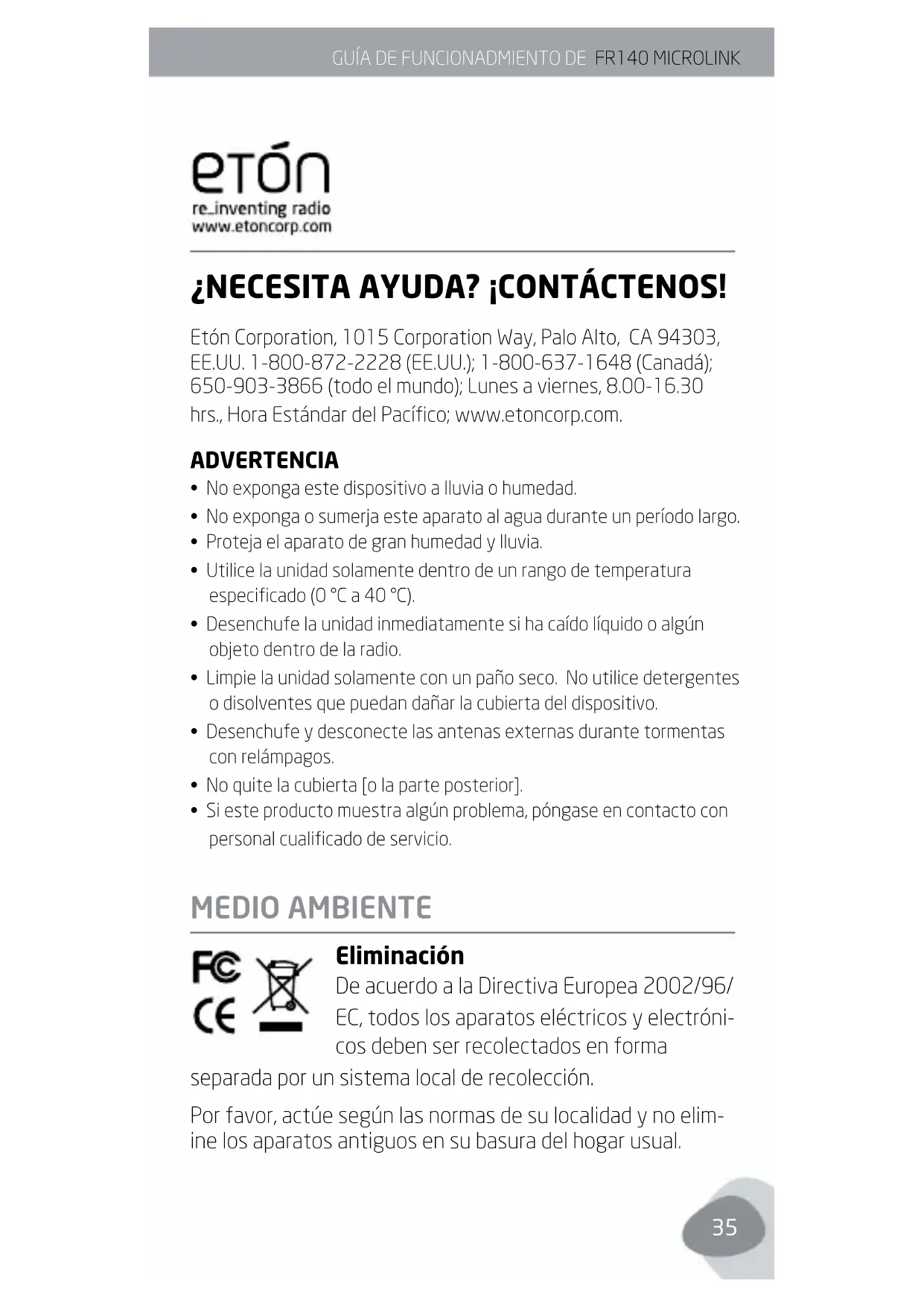 ¿NECESITA AYUDA? ¡CONTÁCTENOS! Etón Corporation, 1015 Corporation Way, Palo Alto, CA 94303, EE.UU. 1-800-872-2228 (EE.UU.); 1-800-637-1648 (Canadá); 650-903-3866 (todo el mundo); Lunes a viernes, 8.00-16.30 hrs., Hora Estándar del Pacíco; www.etoncorp.com. ADVERTENCIA