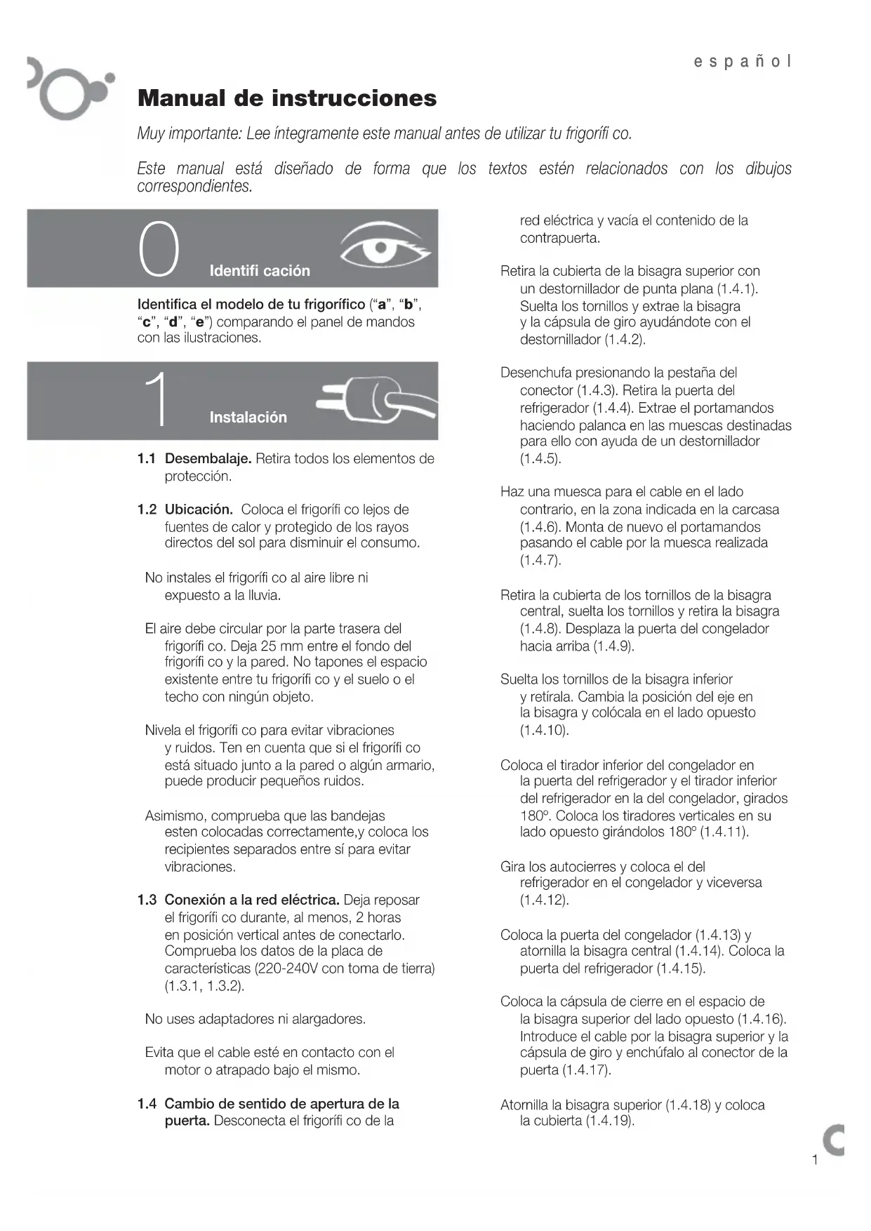 Manual de instrucciones Muy importante: Lee íntegramente este manual antes de utilizar tu frigorífi co. Este manual está diseñado de forma que los textos estén relacionados con los dibujos correspondientes. Instalación Identifi ca el modelo de tu frigorífi co (“a”, “b”, “c”, “d”, “e”) comparando el panel de mandos con las ilustraciones.