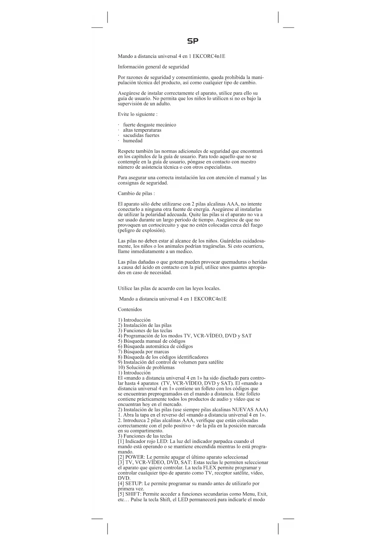 - humedad Respete también las normas adicionales de seguridad que encontrará en los capítulos de la guía de usuario. Para todo aquello que no se contemple en la guía de usuario, póngase en contacto con nuestro número de asistencia técnica o con otros especialistas. Para asegurar una correcta instalación lea con atención el manual y las consignas de seguridad. Cambio de pilas : El aparato sólo debe utilizarse con 2 pilas alcalinas AAA, no intente conectarlo a ninguna otra fuente de energía. Asegúrese al instalarlas de utilizar la polaridad adecuada. Quite las pilas si el aparato no va a ser usado durante un largo período de tiempo. Asegúrese de que no provoquen un cortocircuito y que no estén colocadas cerca del fuego (peligro de explosión). Las pilas no deben estar al alcance de los niños. Guárdelas cuidadosa- mente, los niños o los animales podrían tragárselas. Si esto ocurriera, llame inmediatamente a un medico. Las pilas dañadas o que gotean pueden provocar quemaduras o heridas a causa del ácido en contacto con la piel, utilice unos guantes apropia- dos en caso de necesidad. Utilice las pilas de acuerdo con las leyes locales. Mando a distancia universal 4 en 1 EKCORC4n1E Contenidos