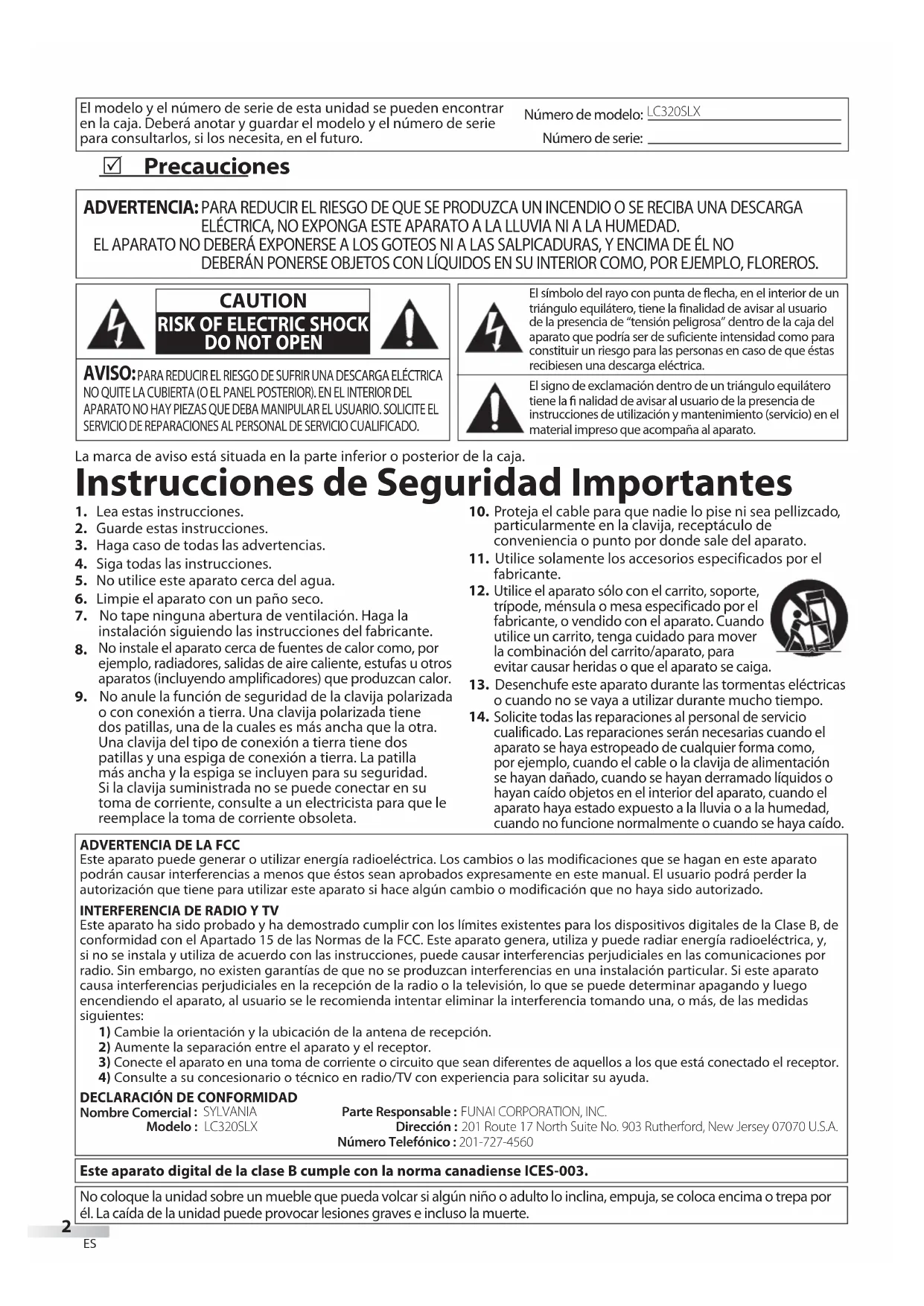 El modelo y el número de serie de esta unidad se pueden encontrar en la caja. Deberá anotar y guardar el modelo y el número de serie para consultarlos, si los necesita, en el futuro.Número de serie:Número de modelo:Este aparato digital de la clase B cumple con la norma canadiense ICES-003.ADVERTENCIA DE LA FCC Este aparato puede generar o utilizar energía radioeléctrica. Los cambios o las modificaciones que se hagan en este aparato podrán causar interferencias a menos que éstos sean aprobados expresamente en este manual. El usuario podrá perder la autorización que tiene para utilizar este aparato si hace algún cambio o modificación que no haya sido autorizado.INTERFERENCIA DE RADIO Y TV Este aparato ha sido probado y ha demostrado cumplir con los límites existentes para los dispositivos digitales de la Clase B, de conformidad con el Apartado 15 de las Normas de la FCC. Este aparato genera, utiliza y puede radiar energía radioeléctrica, y, si no se instala y utiliza de acuerdo con las instrucciones, puede causar interferencias perjudiciales en las comunicaciones por radio. Sin embargo, no existen garantías de que no se produzcan interferencias en una instalación particular. Si este aparato causa interferencias perjudiciales en la recepción de la radio o la televisión, lo que se puede determinar apagando y luego encendiendo el aparato, al usuario se le recomienda intentar eliminar la interferencia tomando una, o más, de las medidas siguientes:1) Cambie la orientación y la ubicación de la antena de recepción.2) Aumente la separación entre el aparato y el receptor. 3) Conecte el aparato en una toma de corriente o circuito que sean diferentes de aquellos a los que está conectado el receptor. 4) Consulte a su concesionario o técnico en radio/TV con experiencia para solicitar su ayuda.DECLARACIÓN DE CONFORMIDADNombre Comercial : SYLVANIA Parte Responsable : FUNAI CORPORATION, INC. Modelo : LC320SLX Dirección : 201 Route 17 North Suite No. 903 Rutherford, New Jersey 07070 U.S.A. Número Telefónico : 201-727-4560 No coloque la unidad sobre un mueble que pueda volcar si algún niño o adulto lo inclina, empuja, se coloca encima o trepa por él. La caída de la unidad puede provocar lesiones graves e incluso la muerte.LC320SLX3