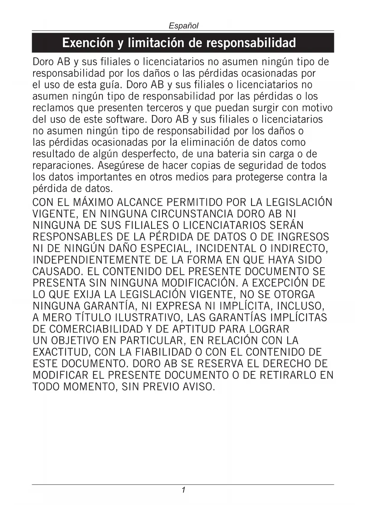 CON EL MAXIMO ALCANCE PERMITIDO POR LA LEGISLACION VIGENTE, EN NINGUNA CIRCUNSTANCIA DORO AB NI NINGUNA DE SUS FILIALES O LICENCIATARIOS SERAN RESPONSABLES DE LA PERDIDA DE DATOS O DE INGRESOS NI DE NINGUN DANO ESPECIAL, INCIDENTAL O INDIRECTO, INDEPENDIENTemente DE LA FORMA EN QUE HAYA SIDO CAUSADO. EL CONTENIDO DEL PRESENTE DOCUMENTO SE PRESENTA SIN NINGUNA MODIFICACION. A EXCEPCION DE LO QUE EXIJA LA LEGISLACION VIGENTE, NO SE OTORGAR NINGUNA GARANTIA, NI EXPRESA NI IMPLICITA, INCLUSO, A MERO TITULO ILUSTRATIVO, LAS GARANTIAS IMPLICITAS DE COMERCIABILIDAD Y DE APTITUD PARA LOGRAR UN OBJECTIVO EN PARTICULAR, EN RELATIOON CON LA EXACTITUD, CON LA FIABILIDAD O CON EL CONTENIDO DEEste DOCUMENTO. DORO AB SE REServa EL DERECHO DE MODIFICAR EL PRESENTE DOCUMENTO O DE RETIRARLO ENTodo MOMento, SIN PREVIO AVISO.
