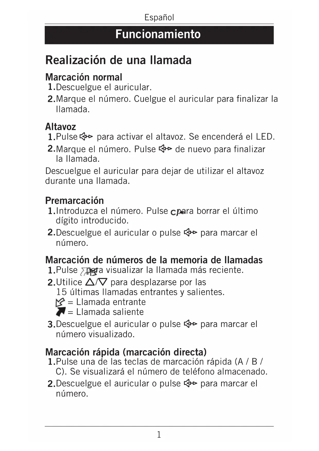 de nuevo para nalizar la llamada. Descuelgue el auricular para dejar de utilizar el altavoz durante una llamada. Premarcación Introduzca el número. Pulse para borrar el último dígito introducido. Descuelgue el auricular o pulse