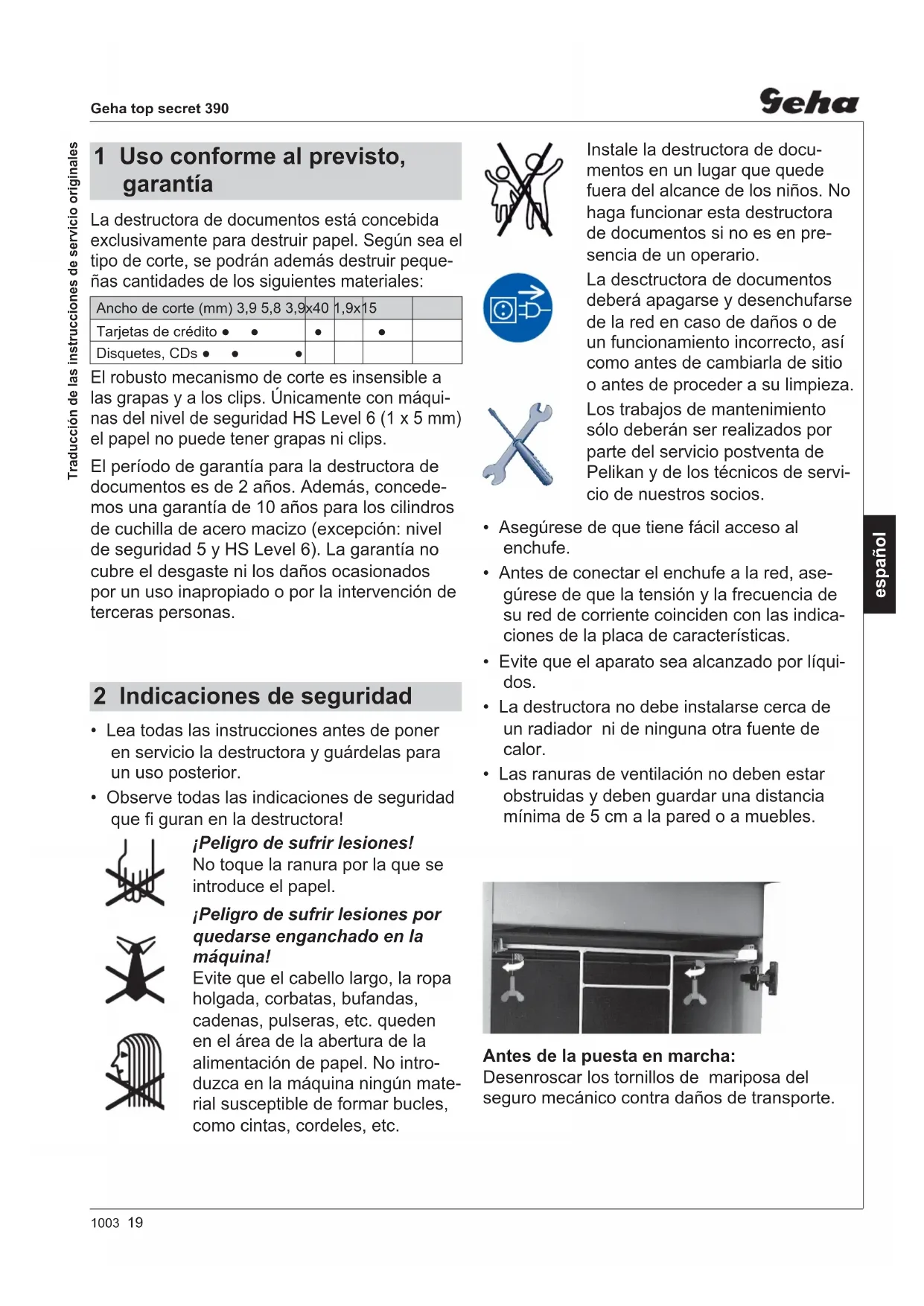 - EN 60950-1:20061003 19 Geha top secret 390 español La destructora de documentos está concebida exclusivamente para destruir papel. Según sea el tipo de corte, se podrán además destruir peque- ñas cantidades de los siguientes materiales: Ancho de corte (mm) 3,9 5,8 3,9x40 1,9x15 Tarjetas de crédito ●● ● ● Disquetes, CDs ●● ● El robusto mecanismo de corte es insensible a las grapas y a los clips. Únicamente con máqui- nas del nivel de seguridad HS Level 6 (1 x 5 mm) el papel no puede tener grapas ni clips. El período de garantía para la destructora de documentos es de 2 años. Además, concede- mos una garantía de 10 años para los cilindros de cuchilla de acero macizo (excepción: nivel de seguridad 5 y HS Level 6). La garantía no cubre el desgaste ni los daños ocasionados por un uso inapropiado o por la intervención de terceras personas. 1 Uso conforme al previsto, garantía Antes de la puesta en marcha: Desenroscar los tornillos de mariposa del seguro mecánico contra daños de transporte. Instale la destructora de docu- mentos en un lugar que quede fuera del alcance de los niños. No haga funcionar esta destructora de documentos si no es en pre- sencia de un operario. La desctructora de documentos deberá apagarse y desenchufarse de la red en caso de daños o de un funcionamiento incorrecto, así como antes de cambiarla de sitio o antes de proceder a su limpieza. Los trabajos de mantenimiento sólo deberán ser realizados por parte del servicio postventa de Pelikan y de los técnicos de servi- cio de nuestros socios.