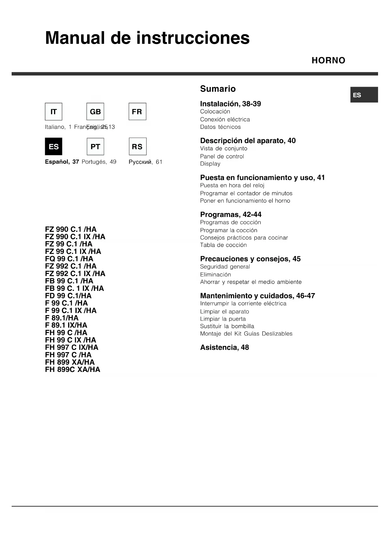 - son numéro de série (S/N) Ces informations figurent sur la plaque signalétique apposée sur l’appareil AssistanceES HORNO Sumario Instalación, 38-39 Colocación Conexión eléctrica Datos técnicos Descripción del aparato, 40 Vista de conjunto Panel de control Display Puesta en funcionamiento y uso, 41 Puesta en hora del reloj Programar el contador de minutos Poner en funcionamiento el horno Programas, 42-44 Programas de cocción Programar la cocción Consejos prácticos para cocinar Tabla de cocción Precauciones y consejos, 45 Seguridad general Eliminación Ahorrar y respetar el medio ambiente Mantenimiento y cuidados, 46-47 Interrumpir la corriente eléctrica Limpiar el aparato Limpiar la puerta Sustituir la bombilla Montaje del Kit Guías Deslizables Asistencia, 48 Manual de instrucciones Italiano, 1 Français, 25 Español, 37 Portugés, 49 English,13