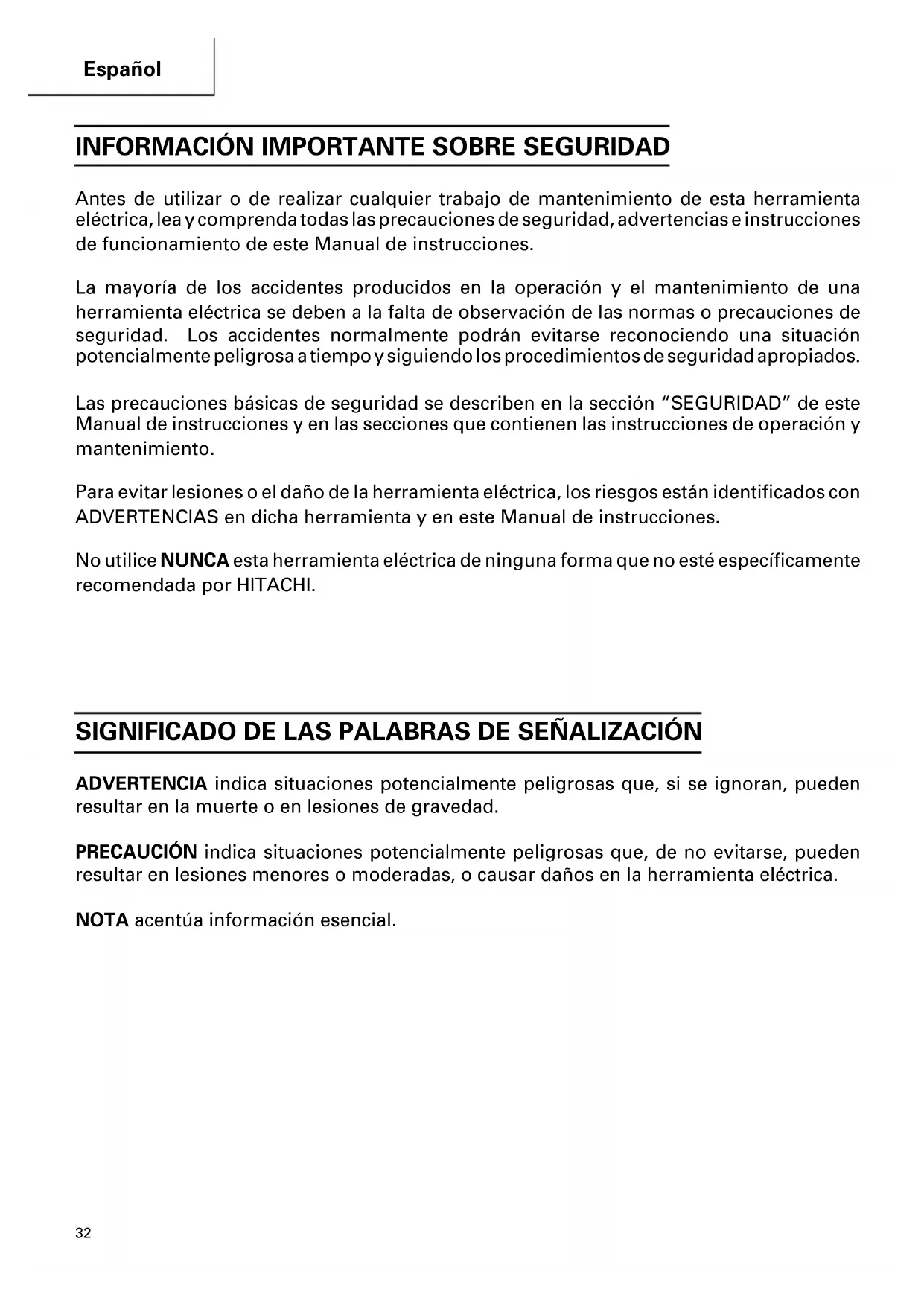 No utilise NUNCA esta herramIENTA electrica de ninguna forma que no está especialmente recomendada por HITACHI.