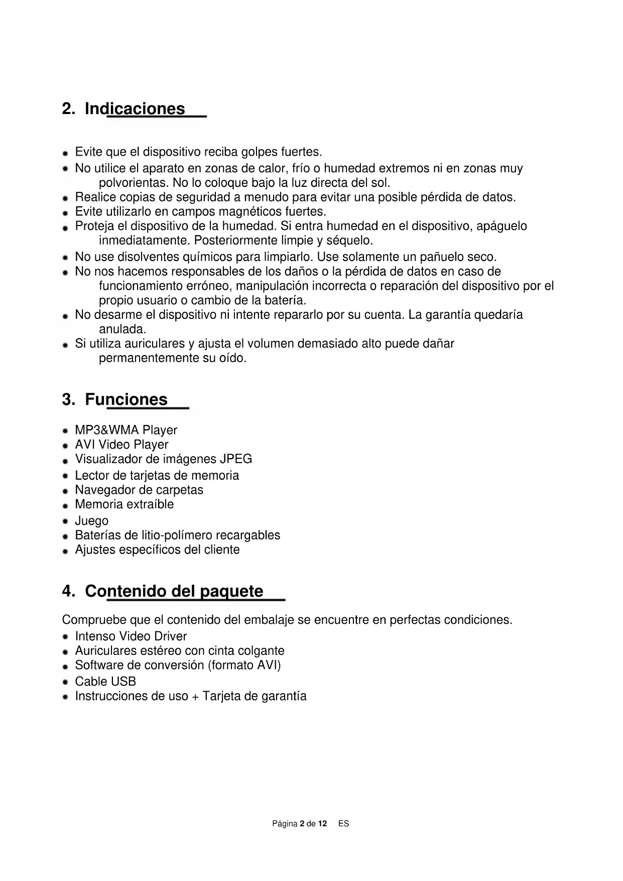 Compruebe que el contenido del embalaje se encuentre en perfectas condiciones. Intenso Video Driver Auriculares estéreo con cinta colgante Software de conversión (formato AVI) Cable USB Instrucciones de uso + Tarjeta de garantíaPágina 3 de 12 ES