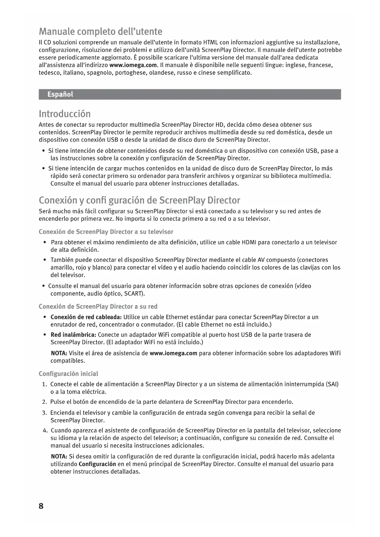 - Si está utilizando el mando a distancia por primera vez, coloque las pilas AAA que se incluyen. Asegúrese de que la orientación de las pilas es correcta. Para obtener información adicional sobre la solución de problemas, visite el área de asistencia de www.iomega.com. Manual del usuario completo El CD de soluciones incluye un manual del usuario en formato HTML con información adicional sobre la instalación, la configuración, la solución de problemas y el uso de ScreenPlay Director. El manual del usuario se actualiza cuando es necesario. Puede descargar la versión más actualizada del manual en el área de asistencia de www.iomega.com. El manual está disponible en inglés, francés, alemán, italiano, español, portugués, holandés, ruso y chino simplificado. Instruções iniciais Antes de conectar o player de mídia em HD ScreenPlay Director, decida como você deseja obter seu conteúdo. O ScreenPlay Director permite reproduzir arquivos de mídia a partir da sua rede doméstica, de um dispositivo USB conectado ou do disco rígido do ScreenPlay Director.