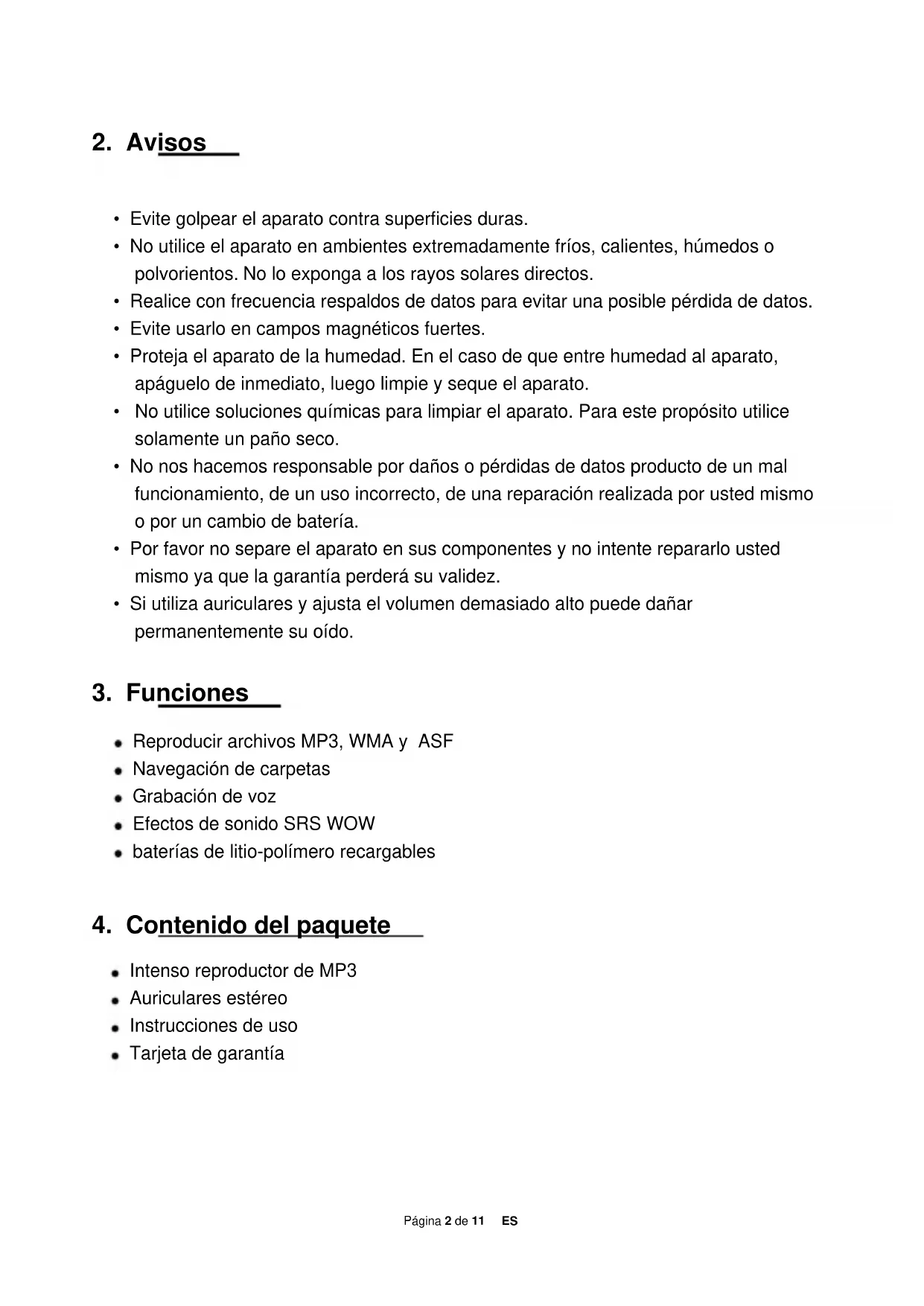 Intenso reproductor de MP3 Auriculares estéreo Instrucciones de uso Tarjeta de garantíaPágina 3 de 11 ES