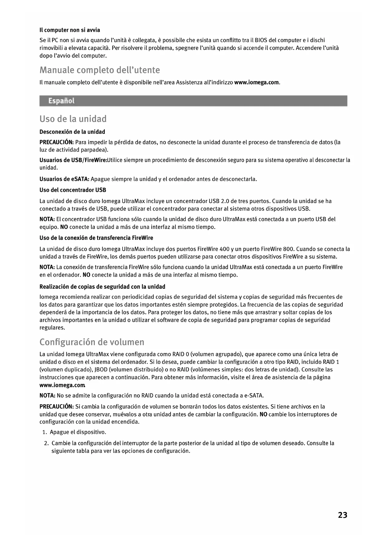 Il computer non si avvia Se il PC non si avvia quando l’unità è collegata, è possibile che esista un conflitto tra il BIOS del computer e i dischi rimovibili a elevata capacità. Per risolvere il problema, spegnere l’unità quando si accende il computer. Accendere l’unità dopo l’avvio del computer. Manuale completo dell’utente Il manuale completo dell’utente è disponibile nell’area Assistenza all’indirizzo www.iomega.com. Uso de la unidad Desconexión de la unidad PRECAUCIÓN: Para impedir la pérdida de datos, no desconecte la unidad durante el proceso de transferencia de datos (la luz de actividad parpadea). Usuarios de USB/FireWire: Utilice siempre un procedimiento de desconexión seguro para su sistema operativo al desconectar la unidad. Usuarios de eSATA: Apague siempre la unidad y el ordenador antes de desconectarla. Uso del concentrador USB La unidad de disco duro Iomega UltraMax incluye un concentrador USB 2.0 de tres puertos. Cuando la unidad se ha conectado a través de USB, puede utilizar el concentrador para conectar al sistema otros dispositivos USB. NOTA: El concentrador USB funciona sólo cuando la unidad de disco duro UltraMax está conectada a un puerto USB del equipo. NO conecte la unidad a más de una interfaz al mismo tiempo. Uso de la conexión de transferencia FireWire La unidad de disco duro Iomega UltraMax incluye dos puertos FireWire 400 y un puerto FireWire 800. Cuando se conecta la unidad a través de FireWire, los demás puertos pueden utilizarse para conectar otros dispositivos FireWire a su sistema. NOTA: La conexión de transferencia FireWire sólo funciona cuando la unidad UltraMax está conectada a un puerto FireWire en el ordenador. NO conecte la unidad a más de una interfaz al mismo tiempo. Realización de copias de seguridad con la unidad Iomega recomienda realizar con periodicidad copias de seguridad del sistema y copias de seguridad más frecuentes de los datos para garantizar que los datos importantes estén siempre protegidos. La frecuencia de las copias de seguridad dependerá de la importancia de los datos. Para proteger los datos, no tiene más que arrastrar y soltar copias de los archivos importantes en la unidad o utilizar el software de copia de seguridad para programar copias de seguridad regulares. Configuración de volumen La unidad Iomega UltraMax viene configurada como RAID 0 (volumen agrupado), que aparece como una única letra de unidad o disco en el sistema del ordenador. Si lo desea, puede cambiar la configuración a otro tipo RAID, incluido RAID 1 (volumen duplicado), JBOD (volumen distribuido) o no RAID (volúmenes simples: dos letras de unidad). Consulte las instrucciones que aparecen a continuación. Para obtener más información, visite el área de asistencia de la página www.iomega.com