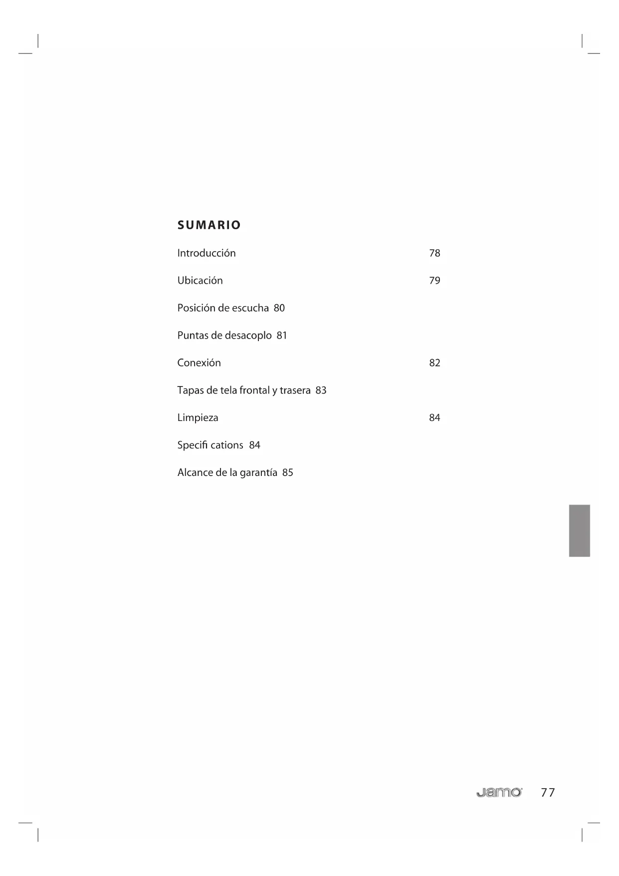 - Muita sellaisia vahinkoja, joiden aiheutuminen on valmistajan vaikutusmahdollisuuksien ulkopuolella. Takuu ei kata kuluja, jotka aiheutuvat tuotteen toimittamisesta huoltoon. Myyjän vastuu rajoittuu tuotteen rikkoutuneen osan korjaamiseen tai vaihtamiseen eikä myyjä ole vastuussa tuotteen käytön mahdollisesti aiheuttamista vahingoista. Korvaava tuote ei voi arvoltaan ylittää takuuehtojen mukaan korvattavaa tuotetta. Jos nämä ehdot, mukaanlukien myyjän vastuun rajoittaminen, ovat ristiriitaisia asiakkaan kotimaassa74 www.jamo.com75 OWNERS MANUAL Jamo R 90776 español77 SUMARIO Introducción 78 Ubicación 79 Posición de escucha 80 Puntas de desacoplo 81 Conexión 82 Tapas de tela frontal y trasera 83 Limpieza 84 Specifi cations 84 Alcance de la garantía 8578 INTRODUCCIÓN ¡Le damos la bienvenida al círculo exclusivo de propietarios de Jamo R 907! Este manual le dará una visión rápida de cómo instalar sus altavoces en la sala. Para una mayor información sobre las tecnologías empleadas le rogamos que consulte la descripción técnica de los R 907. Un primer consejo: tras instalar sus R 907 por primera vez haga prácticas de escucha durante un par de días ante de efectuar ajustes sonoros. Ello va a ser útil para dos cosas. En primer lugar, tendrá una percepción de cómo suenan los altavoces. En segundo lugar, va a ser un tiempo de rodaje para los altavoces puesto que la calidad tonal de este diseño varía ligeramente tras el primer par de días de funcionamiento. Le recordamos que en este manual efectuamos únicamente recomendaciones pues no existen reglas rápidas ni fi jas para la puesta a punto de unos altavoces tan exclusivos. Cuando empiece a ajustar sus prestaciones dentro de la sala de audición no dude en experimentar: cualquier altavoz suena distinto con solamente moverlo unos centímetros. Cambie la ubicación de los altavoces, efectúe pruebas de audición en distintos puntos de la sala hasta obtener el mejor sonido y determinar la posición ideal para la escucha. Confíe siempre en su propio criterio para discernir qué es lo que mejor suena. Nosotros lo hacemos así… ¡Disfrute de la audición! français79 UBICACIÓN Como punto de partida le sugerimos que inicialmente sitúe los R 907 a unos 90 cm de la pared posterior y a unos 120 cm de la pared lateral. La inclinación de los altavoces deberá ser de 10 grados respecto de la pared posterior. Ello provocará una refl exión del sonido generado sobre las paredes posterior y laterales, ofreciendo la impresión acústica de una sala de mayores dimensiones. Recuerde también que un altavoz dipolo no produce sonido en sus laterales. Puede utilizarse esta característica para cancelar refl exiones de las paredes laterales variando simplemente el ángulo de inclinación. 3 ft 4 ft 10˚80 30˚ 30˚