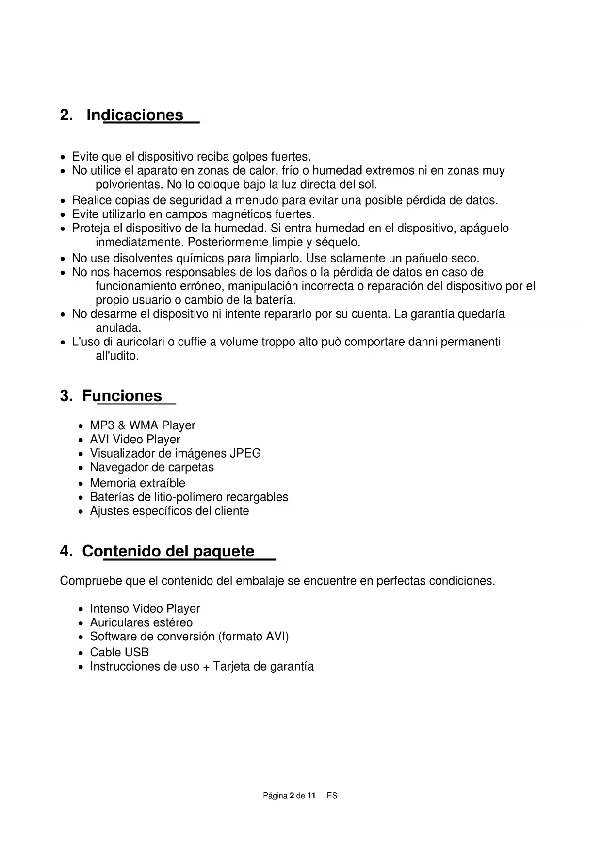 Compruebe que el contenido del embalaje se encuentre en perfectas condiciones. Intenso Video Player Auriculares estéreo Software de conversión (formato AVI) Cable USB Instrucciones de uso + Tarjeta de garantíaPágina 3 de 11 ES