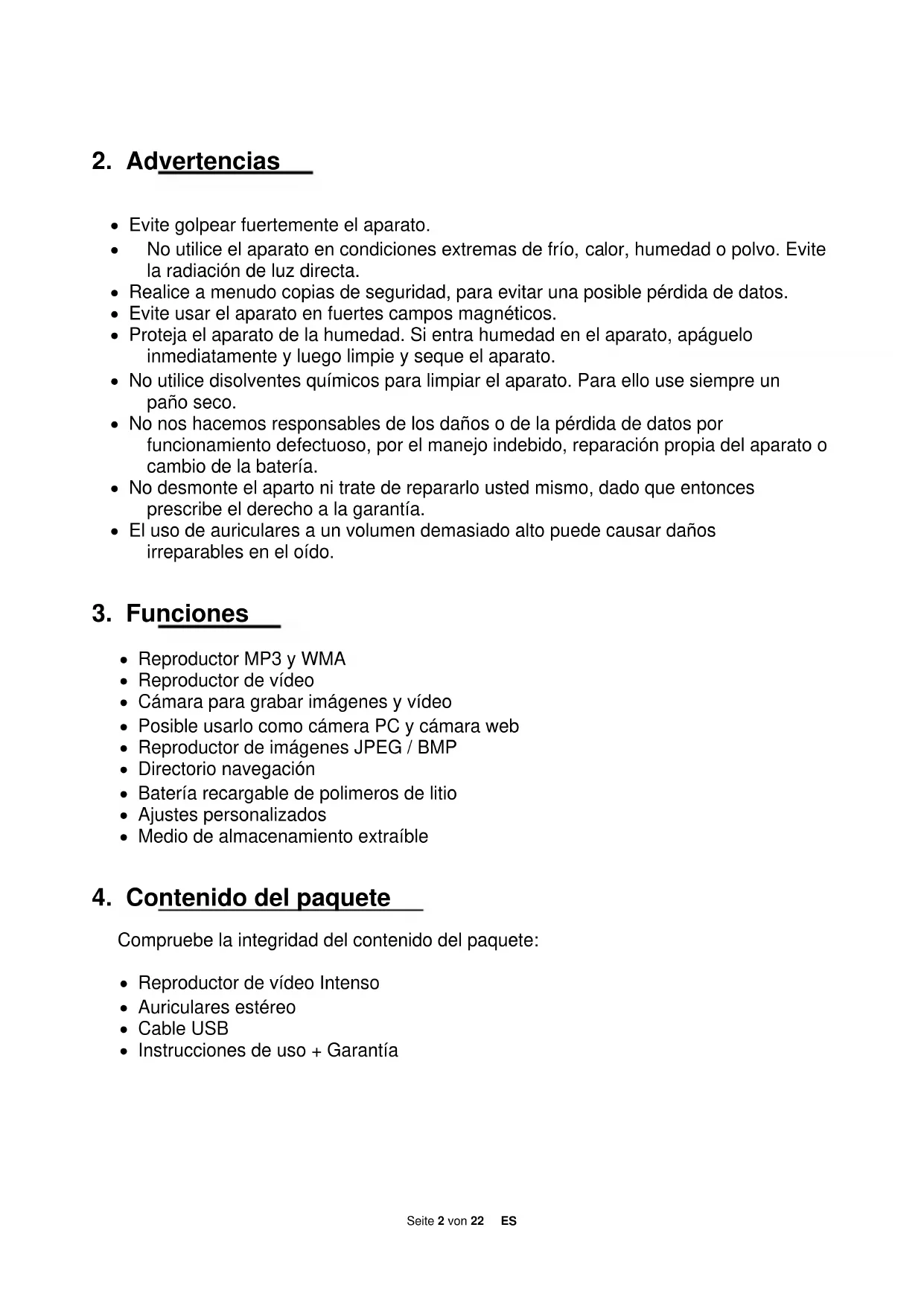 Compruebe la integridad del contenido del paquete: Reproductor de vídeo Intenso Auriculares estéreo Cable USB Instrucciones de uso + GarantíaSeite 3 von 22 ES