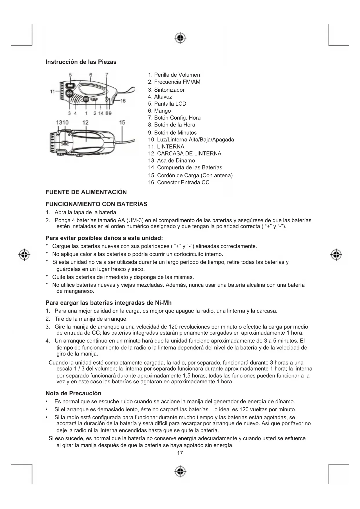 tiempo de funcionamiento de la radio o la linterna dependerá del nivel de la batería y de la velocidad de giro de la manija. Cuando la unidad esté completamente cargada, la radio, por separado, funcionará durante 3 horas a una escala 1 / 3 del volumen; la linterna por separado funcionará durante aproximadamente 1 hora; la linterna por separado funcionará durante aproximadamente 1,5 horas; todas las funciones pueden funcionar a la vez y en este caso las baterías se agotaran en aproximadamente 1 hora. Nota de Precaución