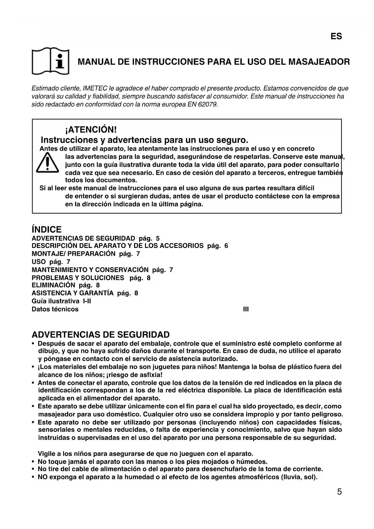 MANUAL DE INSTRUCCIONES PARA EL USO DEL MASAJEADOR Estimado cliente, IMETEC le agradece el haber comprado el presente producto. Estamos convencidos de que