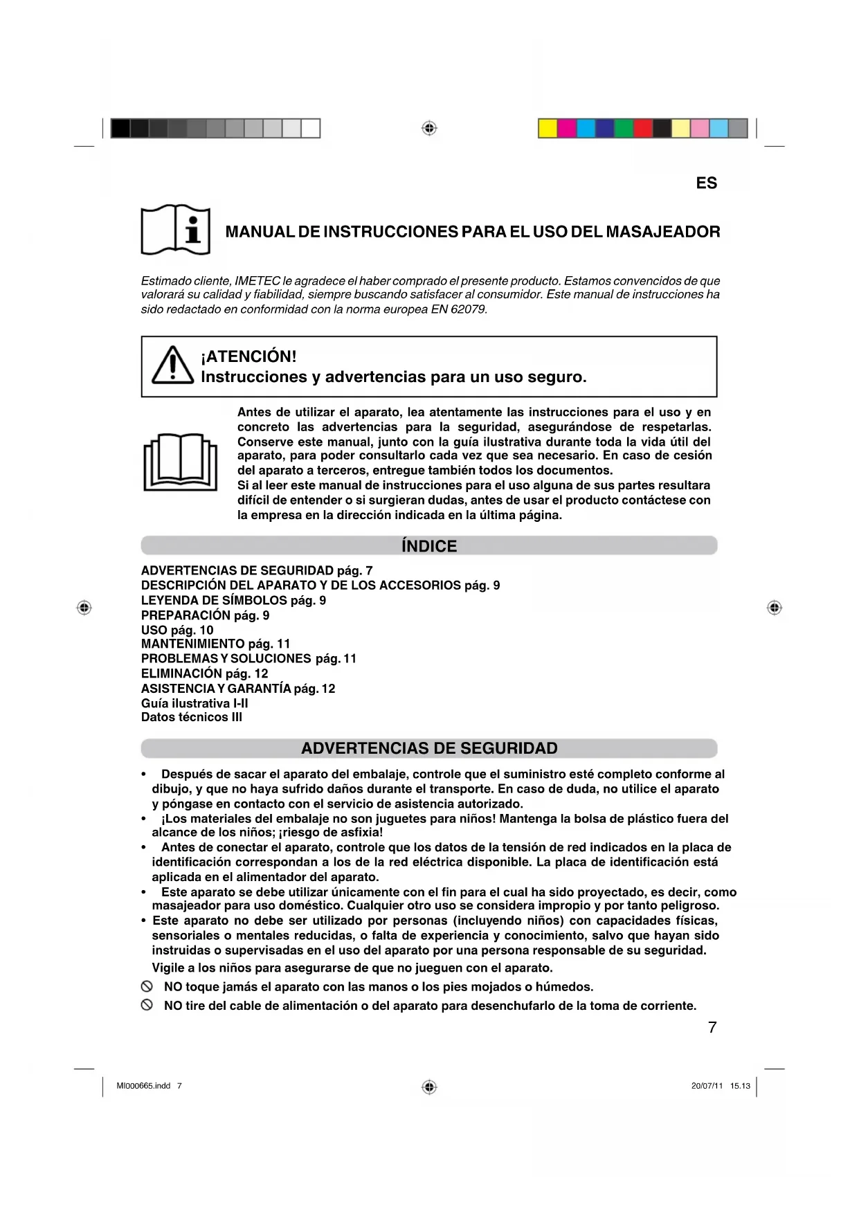 MANUAL DE INSTRUCCIONES PARA EL USO DEL MASAJEADOR Estimado cliente, IMETEC le agradece el haber comprado el presente producto. Estamos convencidos de que