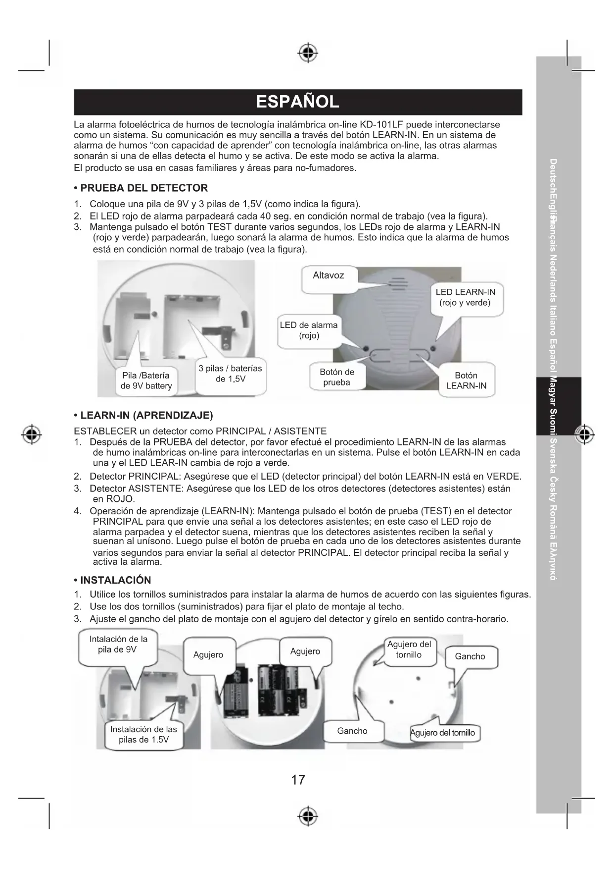 ESPAÑOL La alarma fotoeléctrica de humos de tecnología inalámbrica on-line KD-101LF puede interconectarse como un sistema. Su comunicación es muy sencilla a través del botón LEARN-IN. En un sistema de alarma de humos “con capacidad de aprender” con tecnología inalámbrica on-line, las otras alarmas sonarán si una de ellas detecta el humo y se activa. De este modo se activa la alarma. El producto se usa en casas familiares y áreas para no-fumadores.