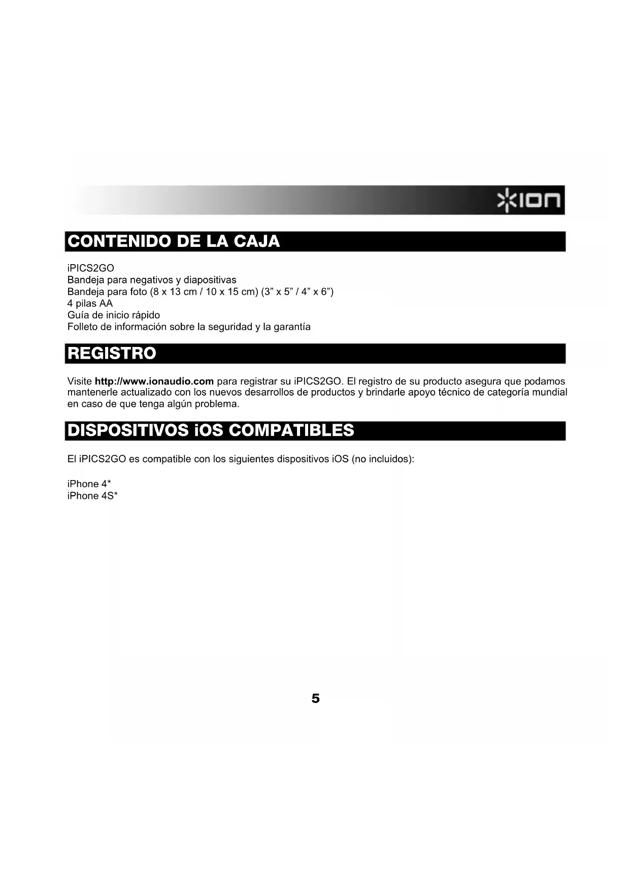 iPICS2GO Bandeja para negativos y diapositivas Bandeja para foto (8 x 13 cm / 10 x 15 cm) (3” x 5” / 4” x 6”) 4 pilas AA Guía de inicio rápido Folleto de información sobre la seguridad y la garantía REGISTRO Visite http://www.ionaudio.com para registrar su iPICS2GO. El registro de su producto asegura que podamos mantenerle actualizado con los nuevos desarrollos de productos y brindarle apoyo técnico de categoría mundial en caso de que tenga algún problema. DISPOSITIVOS iOS COMPATIBLES El iPICS2GO es compatible con los siguientes dispositivos iOS (no incluidos): iPhone 4* iPhone 4S*6