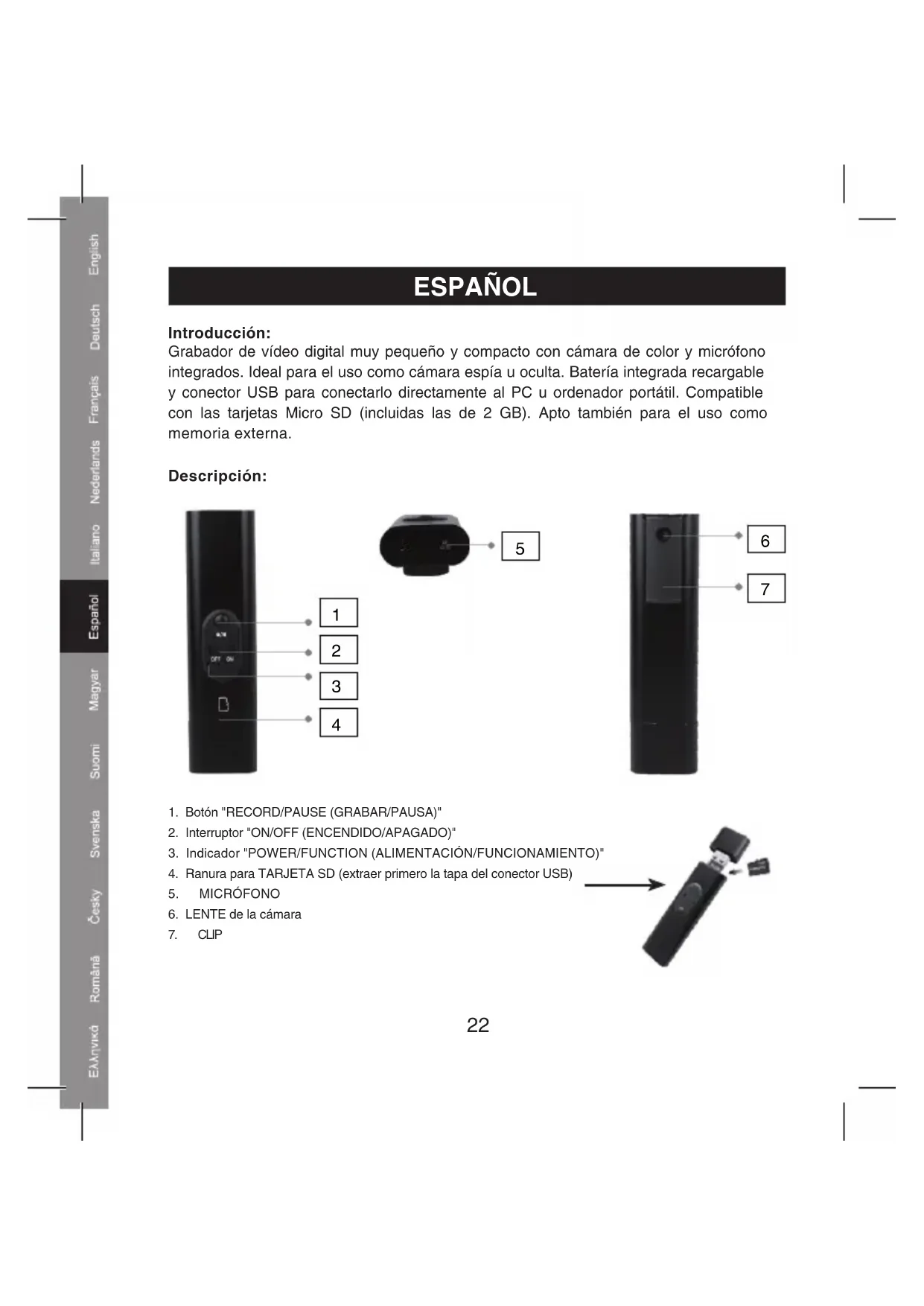 - Temperatura de funcionamiento: 0 °C~ 50 °C24 Declaración de conformidad La empresa infraescrita, Nedis B.V. De Tweeling 28 5215MC ’s-Hertogenbosch Países Bajos Tel.: 0031 73 599 1055 Correo electrónico: info@nedis.com Declara que el producto: Marca: König Electronic Modelo: SEC-DVRCAM10 Descripción: Mini DVR con cámara integrada es conforme a las siguientes normas: EN 55022: 2006 Clase B EN 55024: 1998+A1: 2001+A2: 2003 Y cumple con todos los requisitos de las directivas de la Unión Europea 2004/108/CE ‘s-Hertogenbosch, 02-03-2009 Dña. J. Gilad Directora de compras25 Medidas de seguridad: No exponga el producto al agua ni a la humedad. Mantenimiento: Limpiar exclusivamente con un paño seco. No utilizar disolventes ni productos abrasivos. Garantía: No se aceptará ninguna garantía o responsabilidad derivada de cualquier cambio o modificaciones realizadas al producto o daños provocados por un uso incorrecto del presente producto. Generalidades: Los diseños y las especificaciones podrán sufrir cambios sin previo aviso. Todos los logotipos y los nombres de productos constituyen patentes o marcas registradas de sus titulares correspondientes y se reconocen aquí como tales. Cuidado: Este producto está señalizado con este símbolo. Así se indica que los productos eléctricos y electrónicos no deben mezclarse con los residuos domésticos. Este tipo de productos se desechan en puntos de recogida habilitados para tal fin. Copyright ©26 MAGYAR NYELVŰ A termék bemutatása: Nagyon kisméretű és kompakt digitális videorögzítő beépített kamerával és mikrofonnal. Kém- és rejtett kameraként kitűnően használható. Beépített tölthető akkumulátorral és USB csatlakozóval van felszerelve, ez utóbbi segítségével közvetlenül csatlakoztatható asztali számítógéphez vagy notebookhoz. Támogatja a Micro SD kártyákat (2 GB-ig). Memóriapálcaként is használható. Bemutatás: