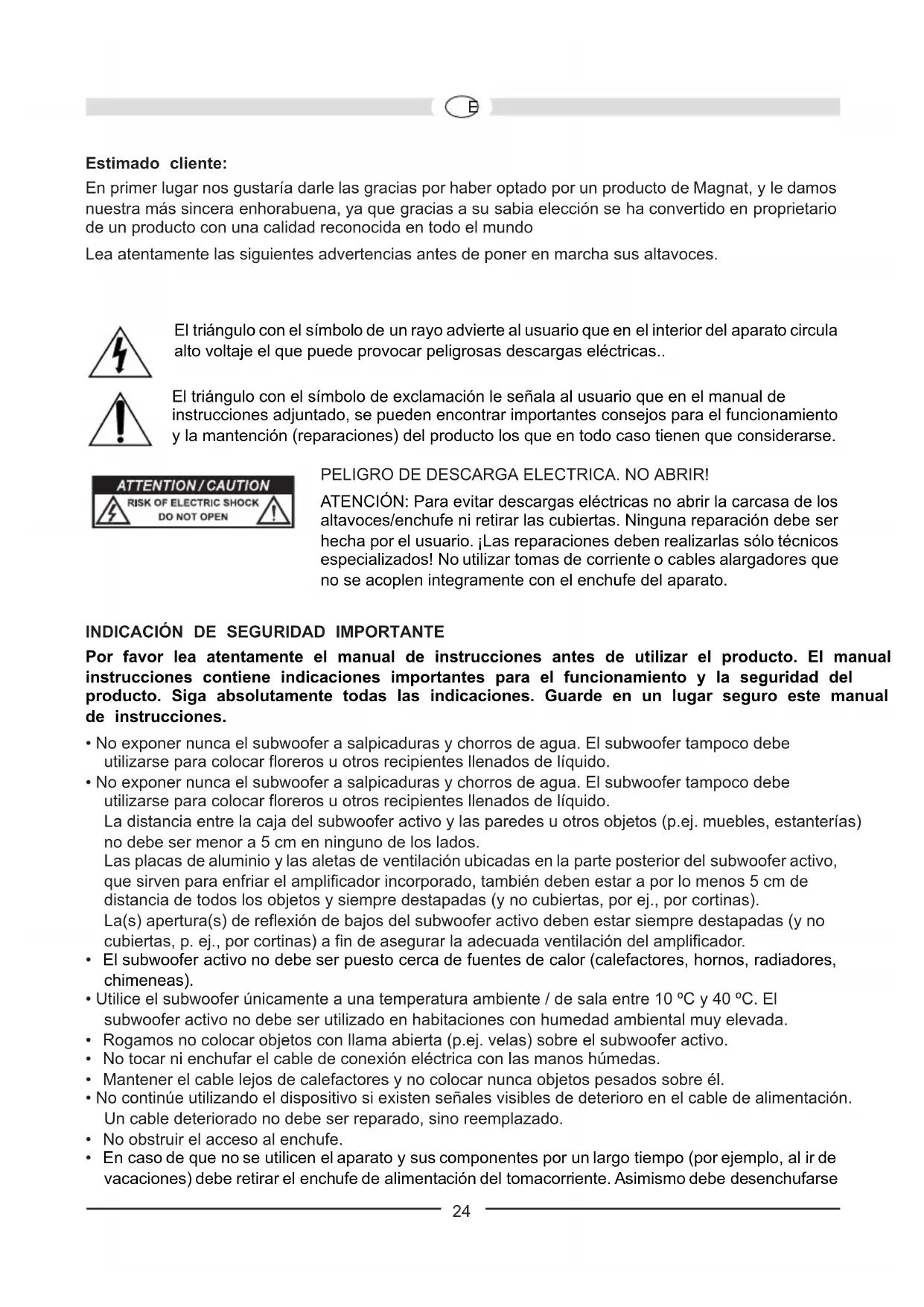 IEstimado cliente: En primer lugar nos gustaría darle las gracias por haber optado por un producto de Magnat, y le damos nuestra más sincera enhorabuena, ya que gracias a su sabia elección se ha convertido en proprietario de un producto con una calidad reconocida en todo el mundo Lea atentamente las siguientes advertencias antes de poner en marcha sus altavoces. El triángulo con el símbolo de un rayo advierte al usuario que en el interior del aparato circula alto voltaje el que puede provocar peligrosas descargas eléctricas.. El triángulo con el símbolo de exclamación le señala al usuario que en el manual de instrucciones adjuntado, se pueden encontrar importantes consejos para el funcionamiento y la mantención (reparaciones) del producto los que en todo caso tienen que considerarse. PELIGRO DE DESCARGA ELECTRICA. NO ABRIR! ATENCIÓN: Para evitar descargas eléctricas no abrir la carcasa de los altavoces/enchufe ni retirar las cubiertas. Ninguna reparación debe ser hecha por el usuario. ¡Las reparaciones deben realizarlas sólo técnicos especializados! No utilizar tomas de corriente o cables alargadores que no se acoplen integramente con el enchufe del aparato.
