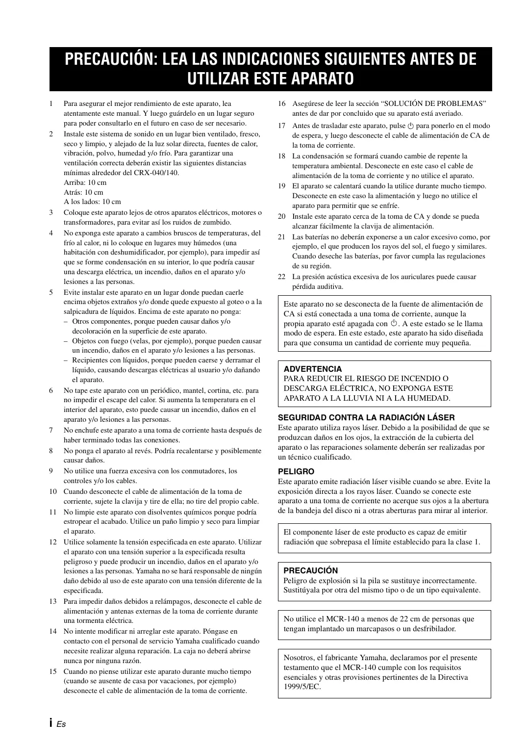 APARATO A LA LLUVIA NI A LA HUMEDAD. SEGURIDAD CONTRA LA RADIACIÓN LÁSER Este aparato utiliza rayos láser. Debido a la posibilidad de que se produzcan daños en los ojos, la extracción de la cubierta del aparato o las reparaciones solamente deberán ser realizadas por un técnico cualificado. PELIGRO Este aparato emite radiación láser visible cuando se abre. Evite la exposición directa a los rayos láser. Cuando se conecte este aparato a una toma de corriente no acerque sus ojos a la abertura de la bandeja del disco ni a otras aberturas para mirar al interior. El componente láser de este producto es capaz de emitir radiación que sobrepasa el límite establecido para la clase 1. PRECAUCIÓN Peligro de explosión si la pila se sustituye incorrectamente. Sustitúyala por otra del mismo tipo o de un tipo equivalente. No utilice el MCR-140 a menos de 22 cm de personas que tengan implantado un marcapasos o un desfribilador. Nosotros, el fabricante Yamaha, declaramos por el presente testamento que el MCR-140 cumple con los requisitos esenciales y otras provisiones pertinentes de la Directiva 1999/5/EC.